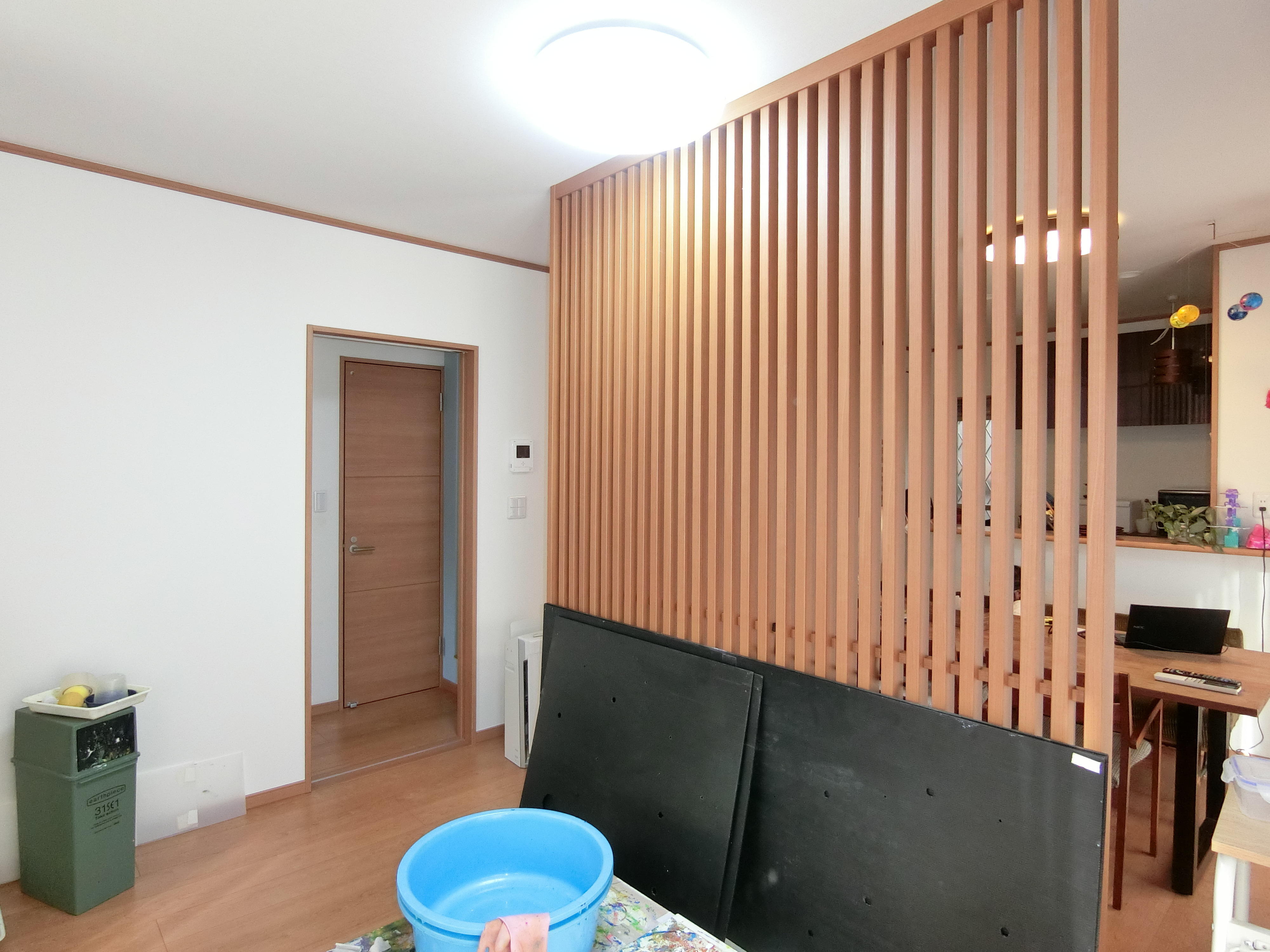 完全に壁で仕切ろうかとのお話もありましたが、息苦しさを感じないよう、またプライベートを考慮して、格子の間仕切りを設置しました。
