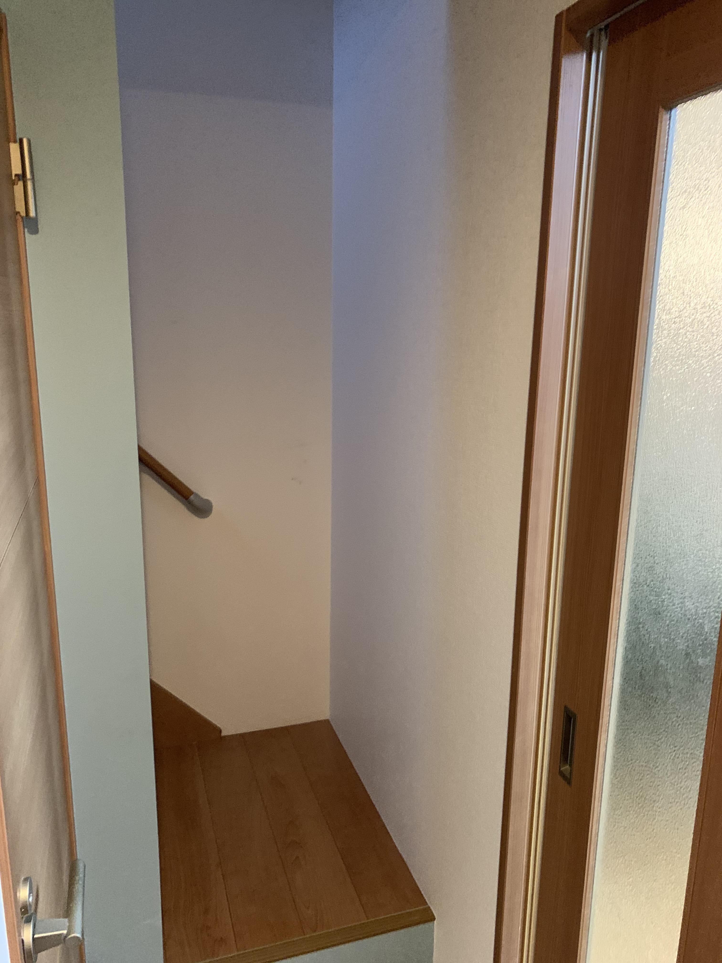 写真右側のドアの奥は元は階段への出入りが出来るスペースでした。ご家族がお帰りになった際に、教室の方と合わずに2階のお部屋へ行けるよう壁を造り塞ぎました。