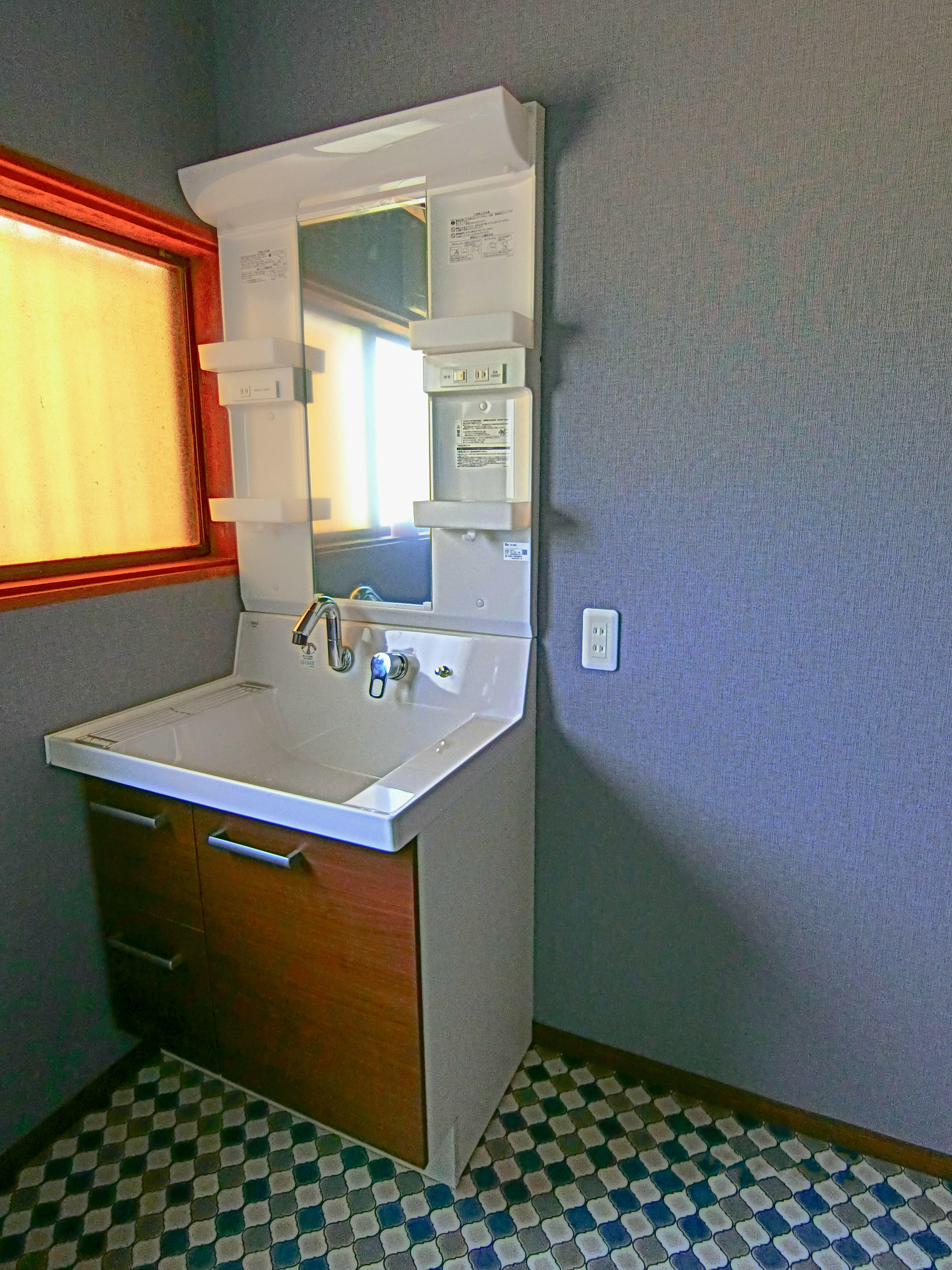 リーズナブルな価格で使いやすい洗面化粧台にしたいとのご希望で「ピアラ」。ボウル内が広くお手入れしやすい壁付水栓。水栓の形がグースネック(ガチョウの首のように湾曲したもの)がピアラの特徴です。