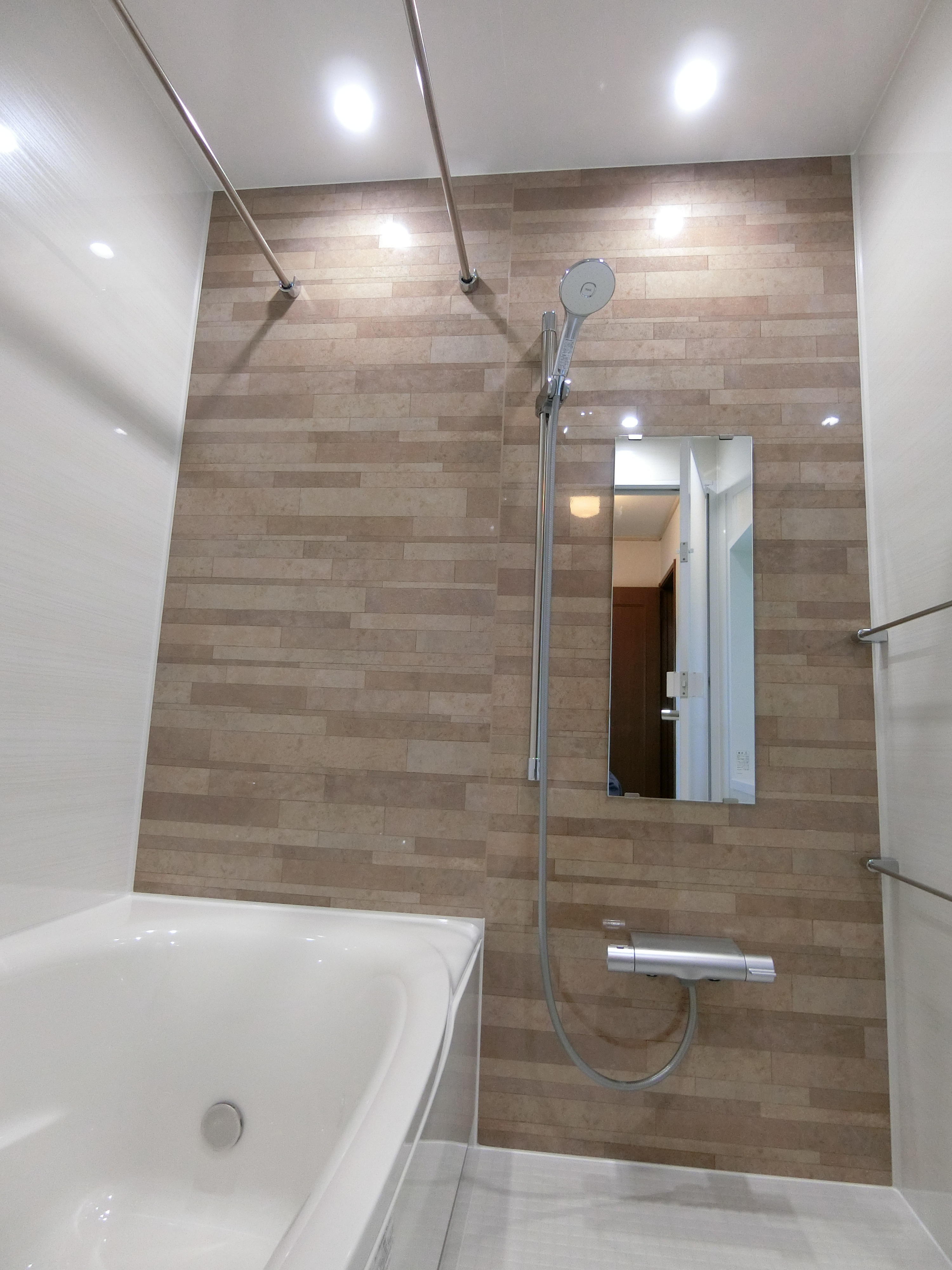 名前の通り照明の明るさと色(電球色と昼白色)を調整できる機能がついたダウンライト照明をご採用されました。リモコンを浴槽から使える位置に取付、浴槽に入りながら気分で照明が調整できます。浴槽はお手入れのしやすい人工大理石「パールクオーツ」。安全に出れるよう手摺も設置しました。