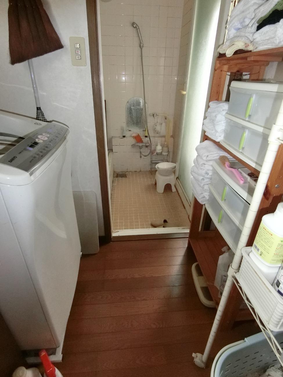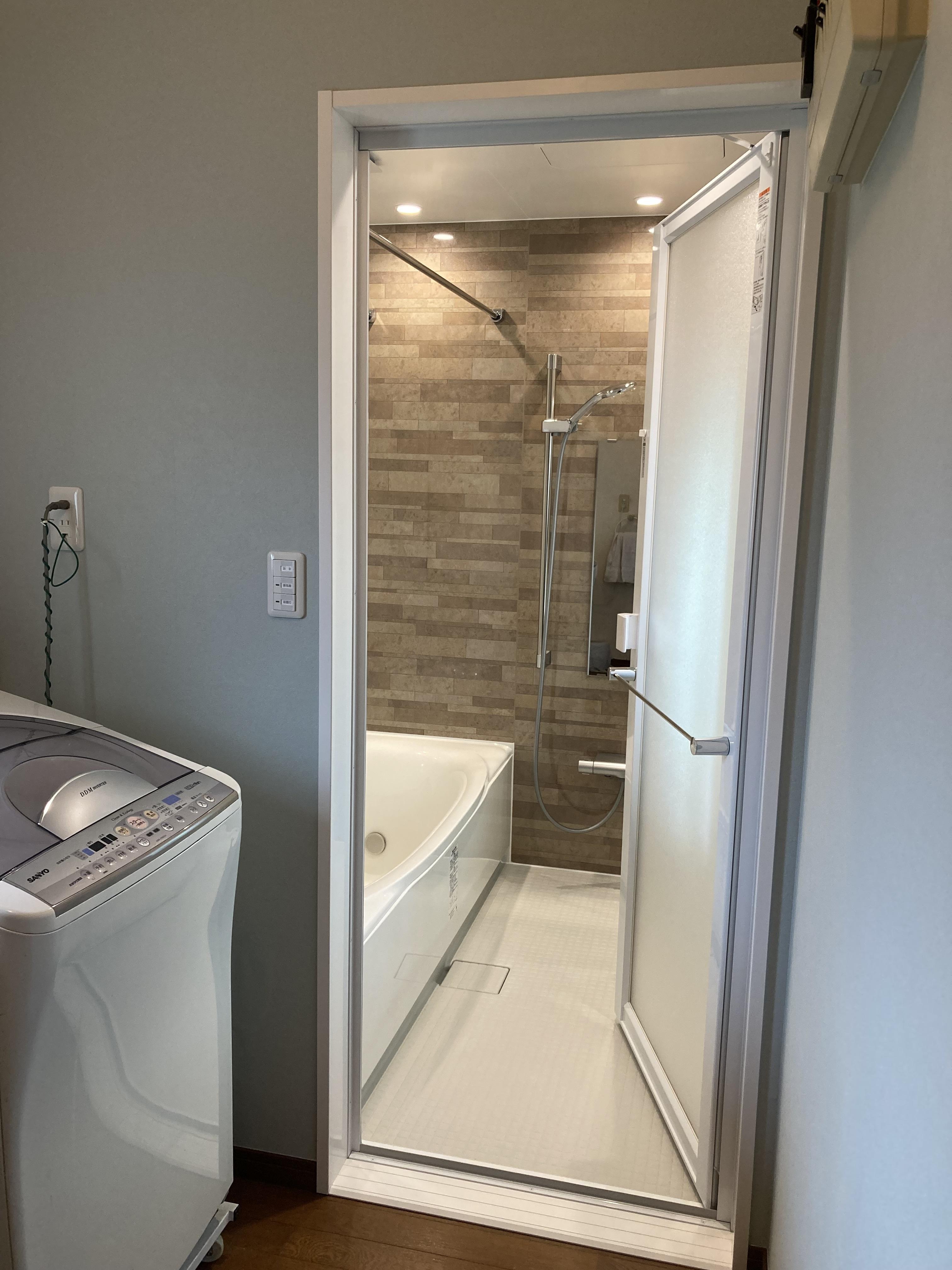お風呂上りに使用するバスタオル置場に困らない「ドア外タオル掛け」。開き戸のみのオプションです。タオル以外にもお風呂を使用しない時はバスマットを干すこともできます。浴室と洗面所との段差をなくし、浴室側のクロスも張り替えました。