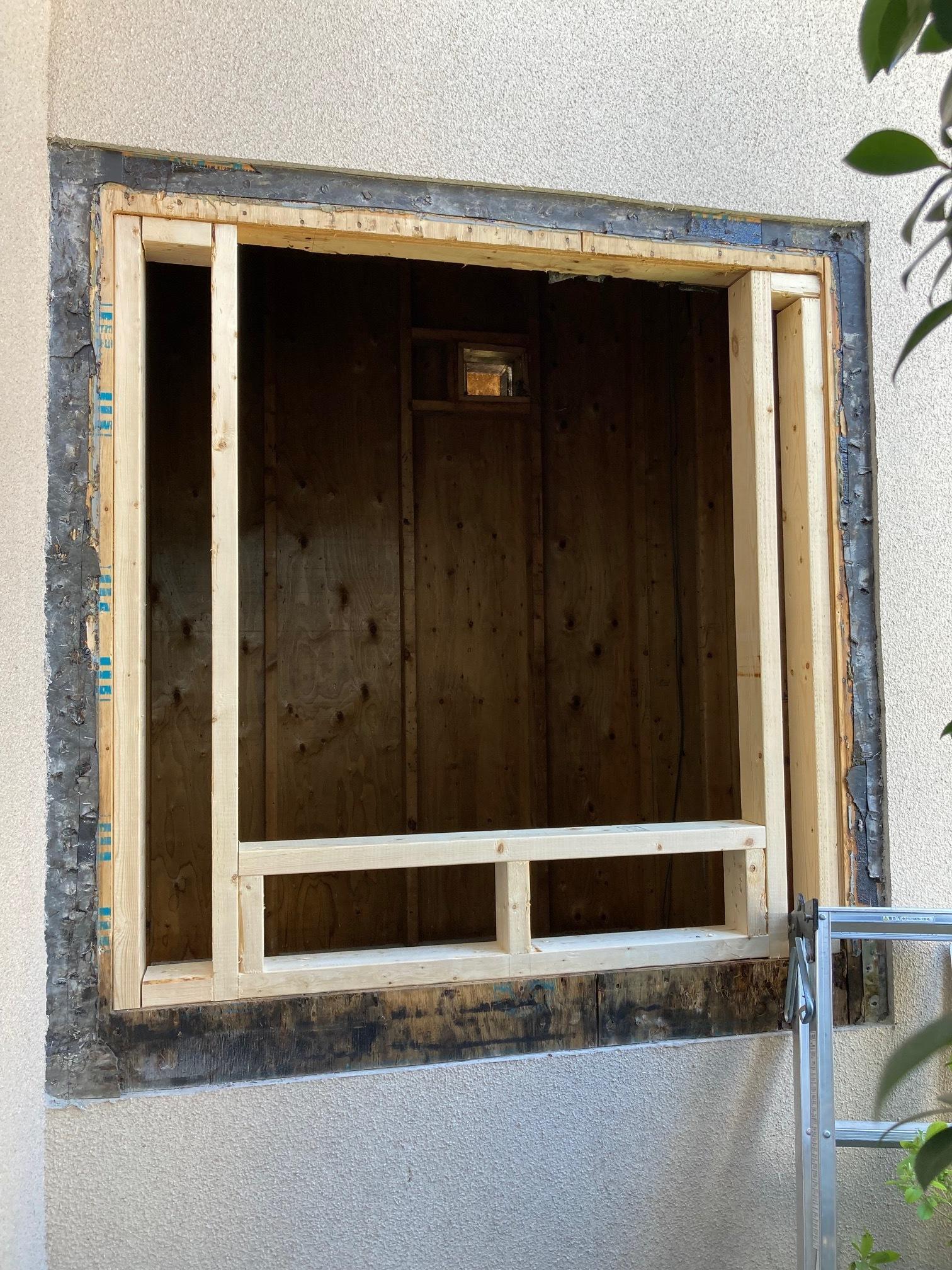 窓の造作下地工事中の写真です。既存窓の開口内であれば、お好みの大きさと位置に窓を設置できます。