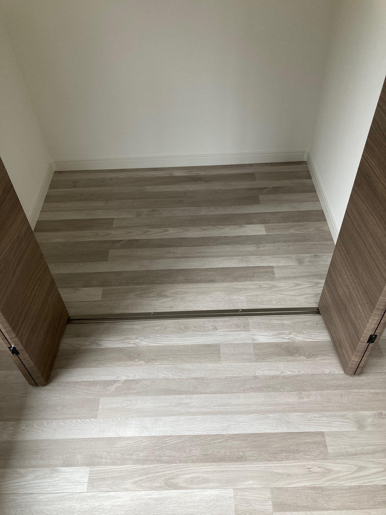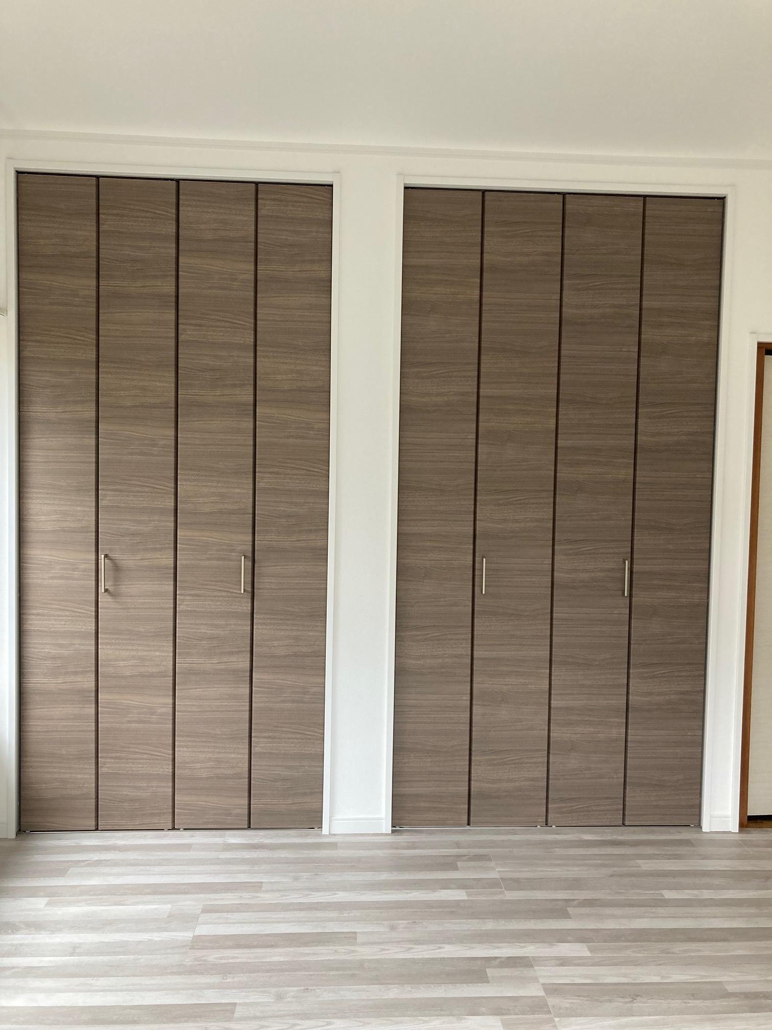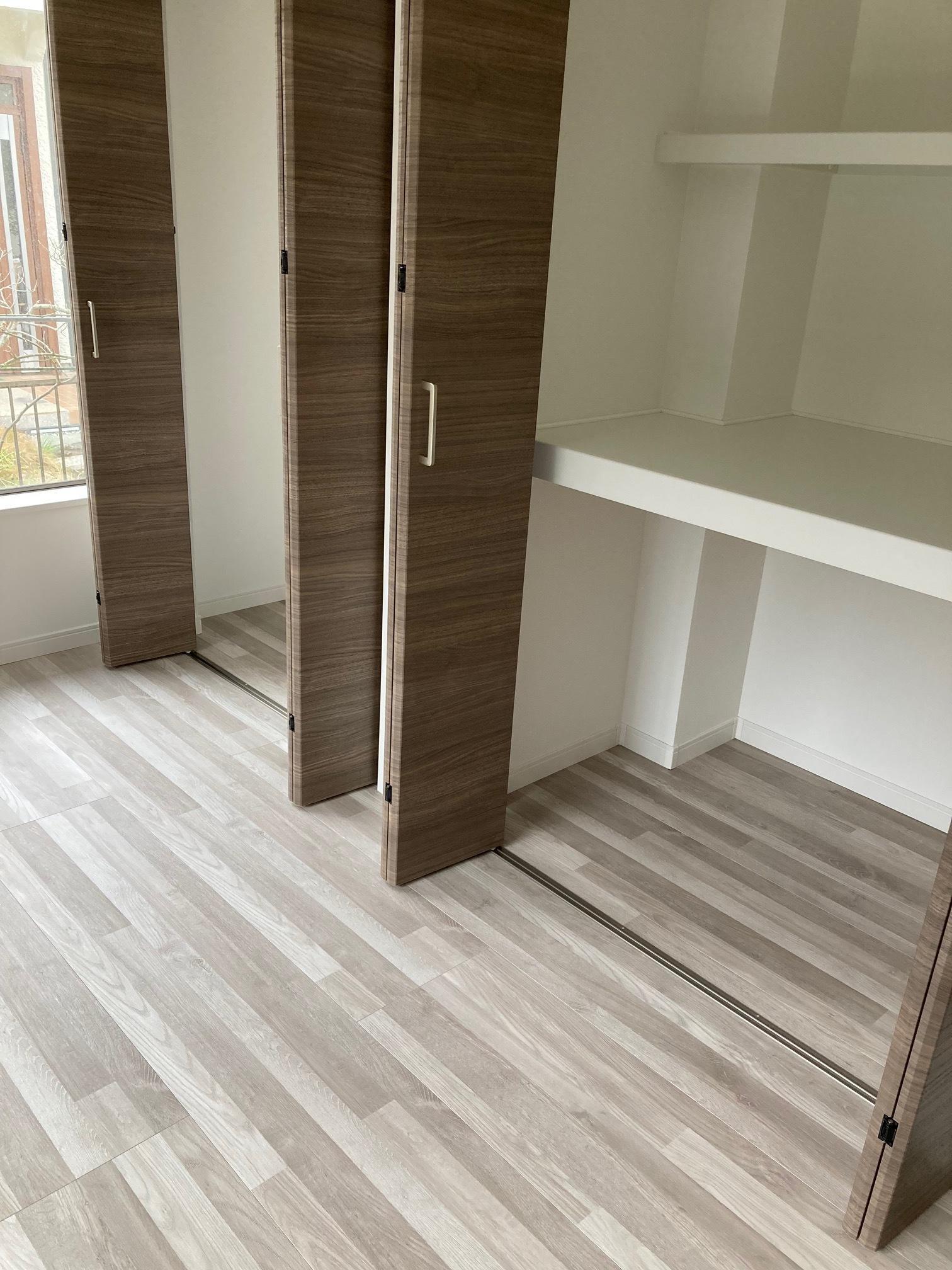 洋室部分の床と同じ床材を貼り、高さも合わせて段差が無いように施工しました。クローゼットの下レールを設置する事によって、扉を左右に動かせるようになりますので、デッドスペースを防げます。