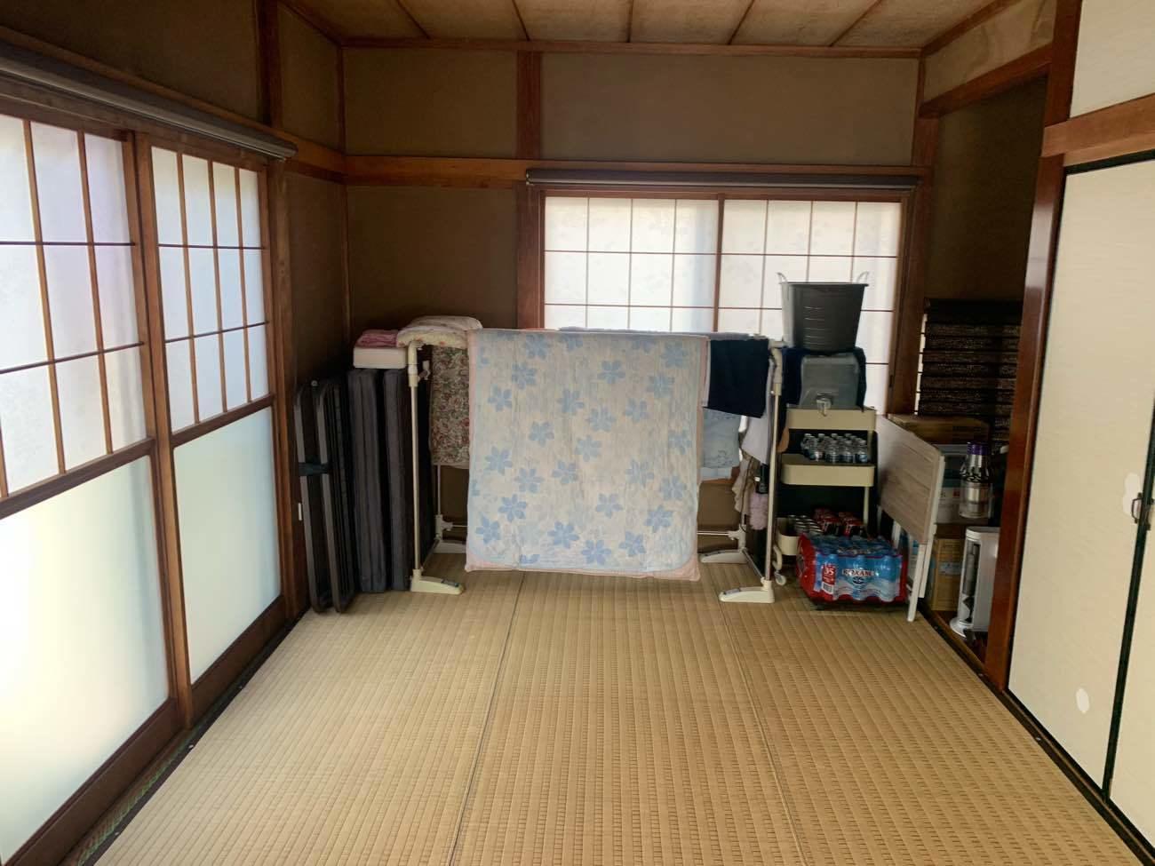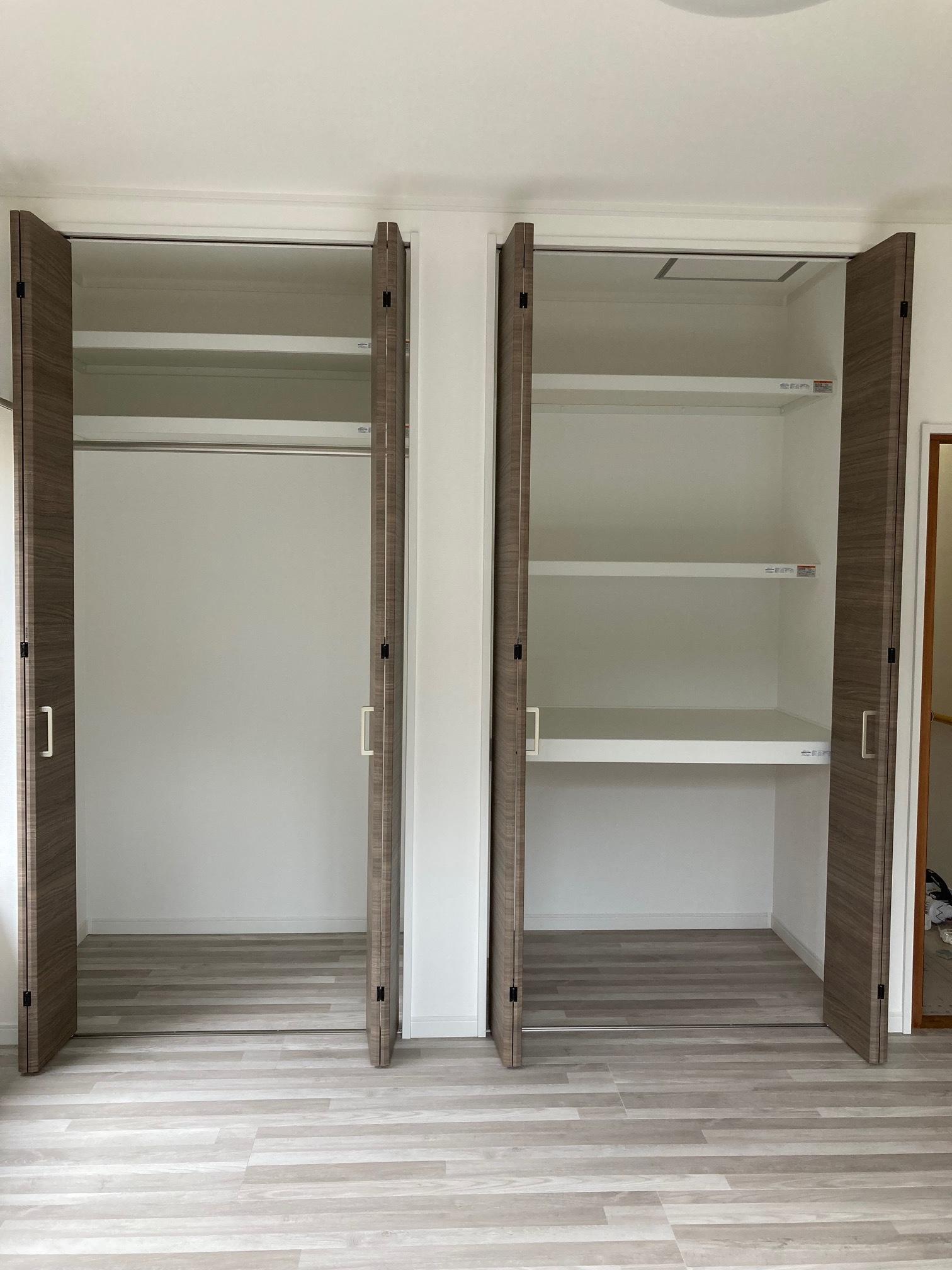 向かって左側の収納には洋服をかける為のハンガーパイプ付の棚を設置し、下部には衣装ケースを入れるように空間を取ってあります。右側の収納は押入に入っていたものをそのまま収納出来るように棚板を設置。出し入れしやすいように上下の棚の奥行きを変えてあり、重い物を収納出来るように可動棚にはしませんでした。又、天井裏を点検出来るように点検口も設置しました。