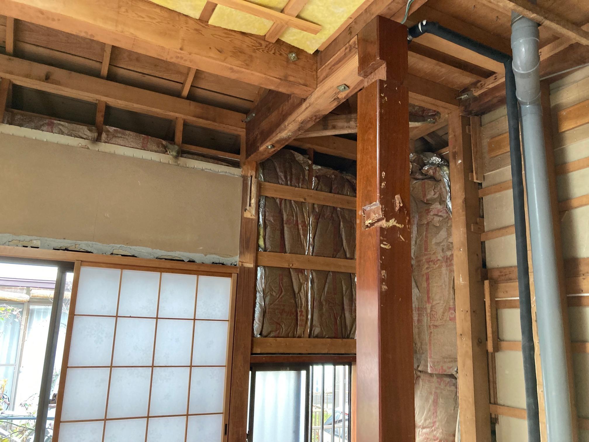 和室を洋室にする為に不要な材木類を撤去して、新しく天井・壁を造作していきます。床柱が取れない構造になっている事とパイプスペースがあった事で、収納部分の空間が少し狭くなりました。リフォームの場合、壊してみないとわからない部分もあるので注意が必要です。