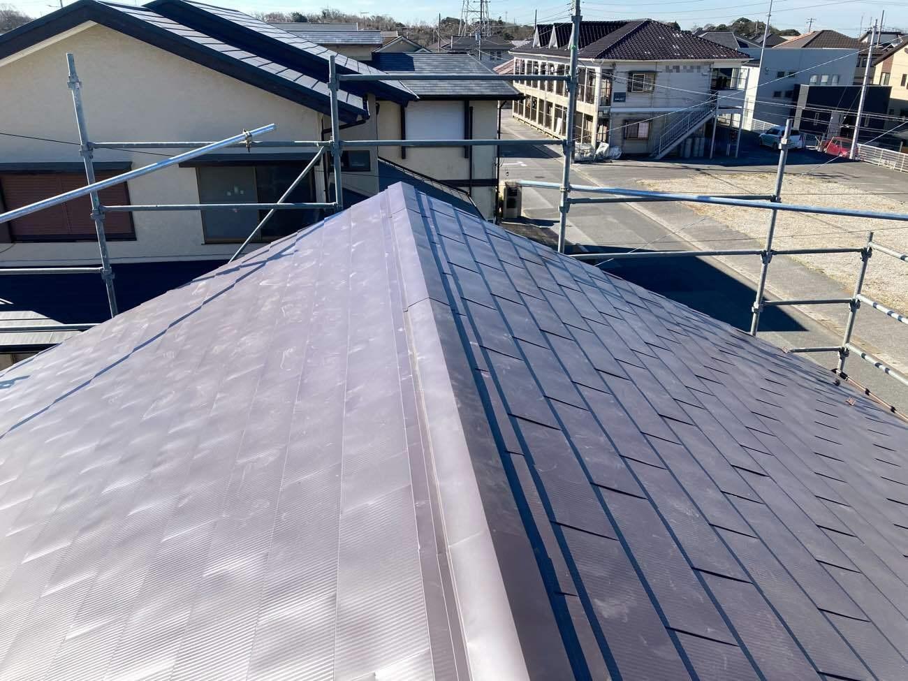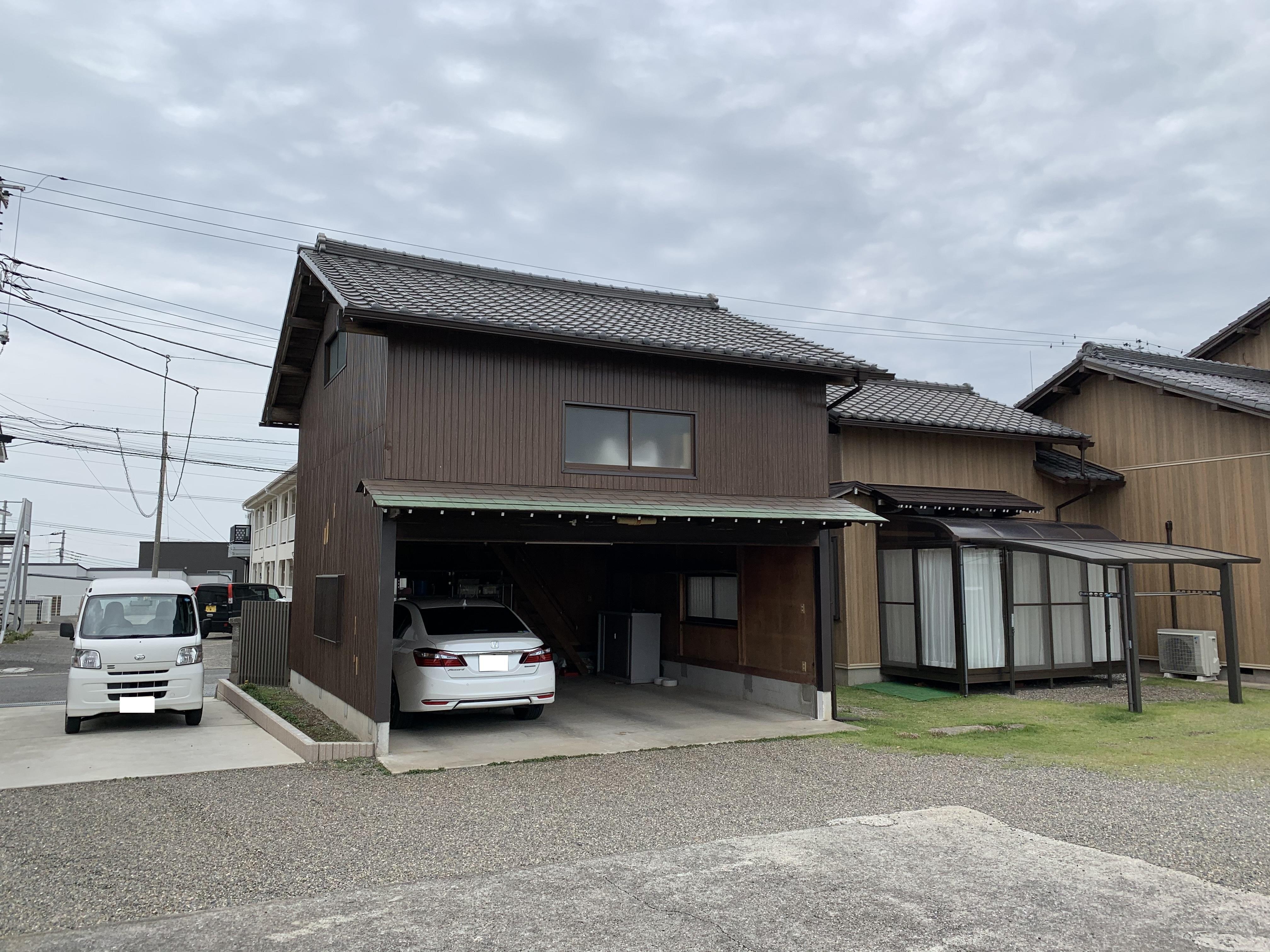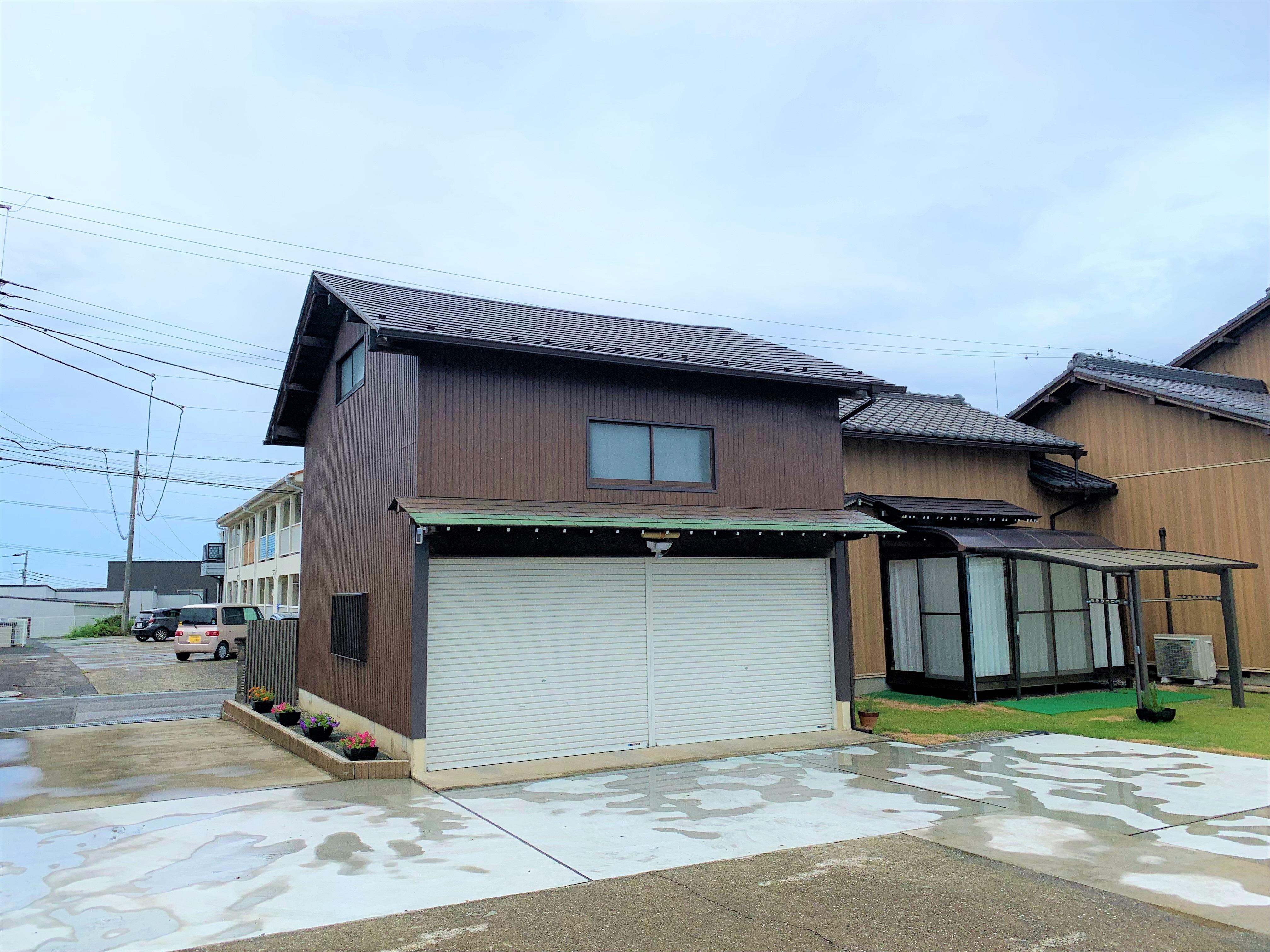 瓦の重みで車庫の屋根の棟がたわんでおり、今後の台風や地震による被害を考え、軽量のガルバリウム鋼板の屋根材へ葺き替えました。