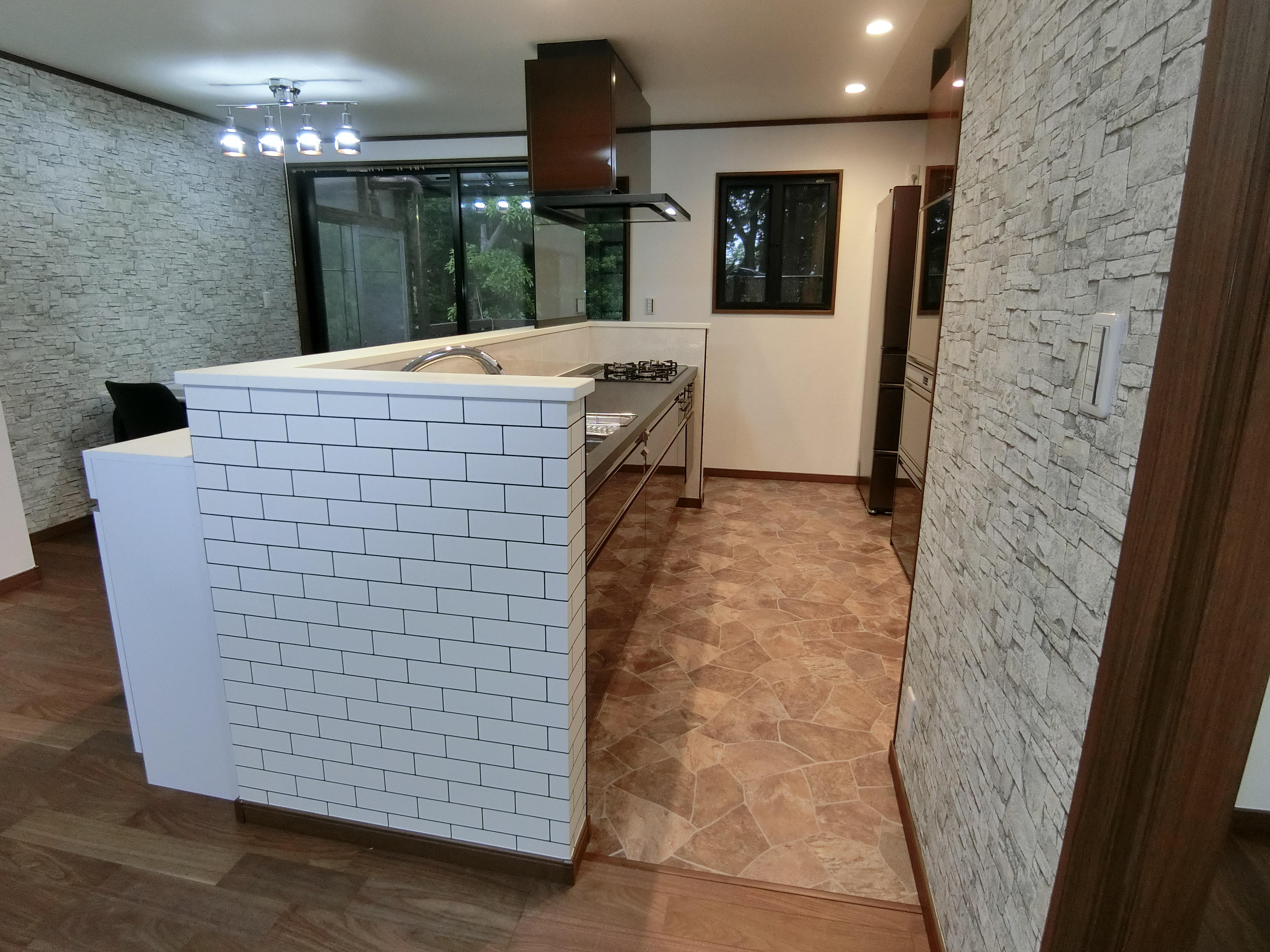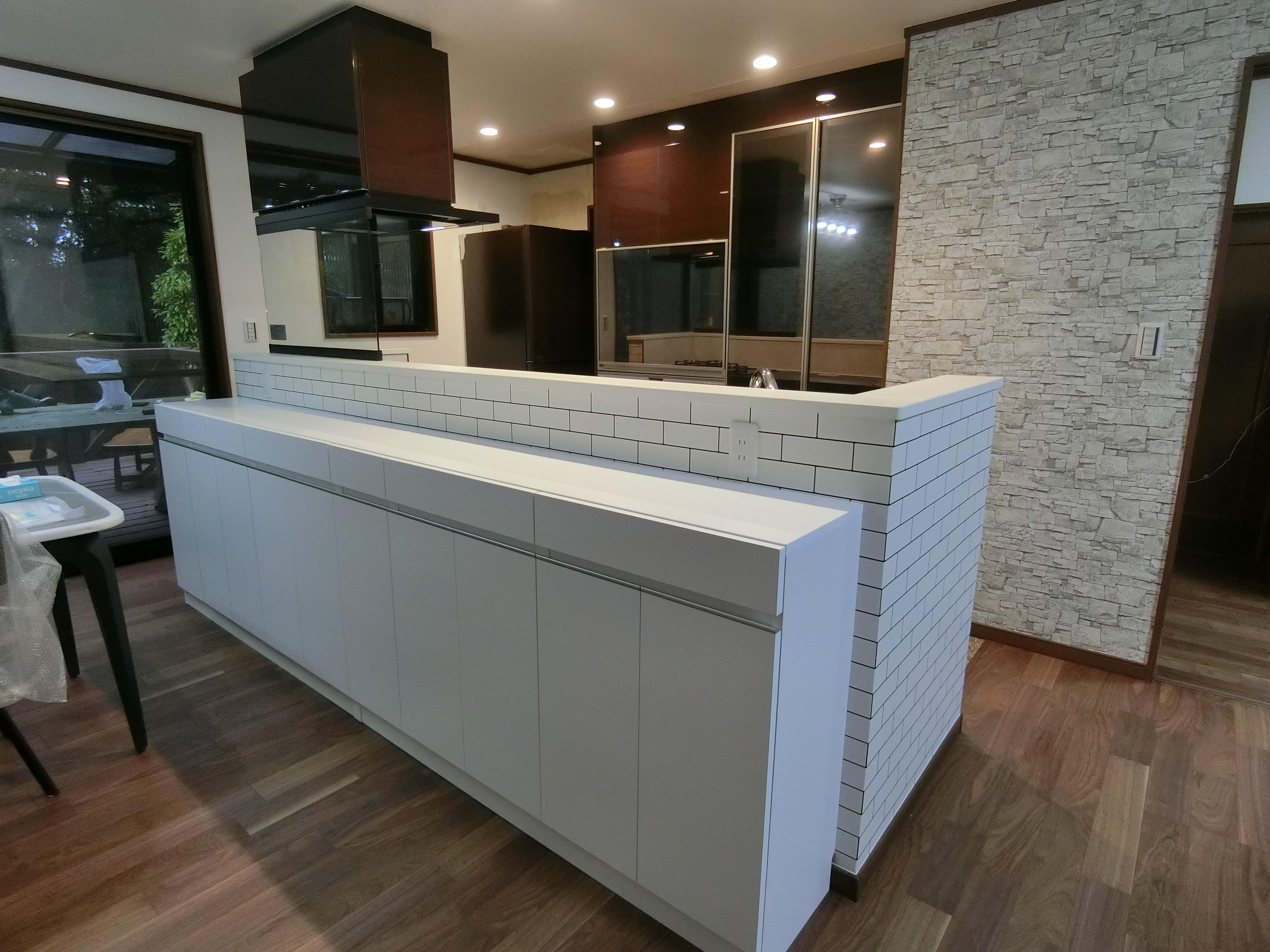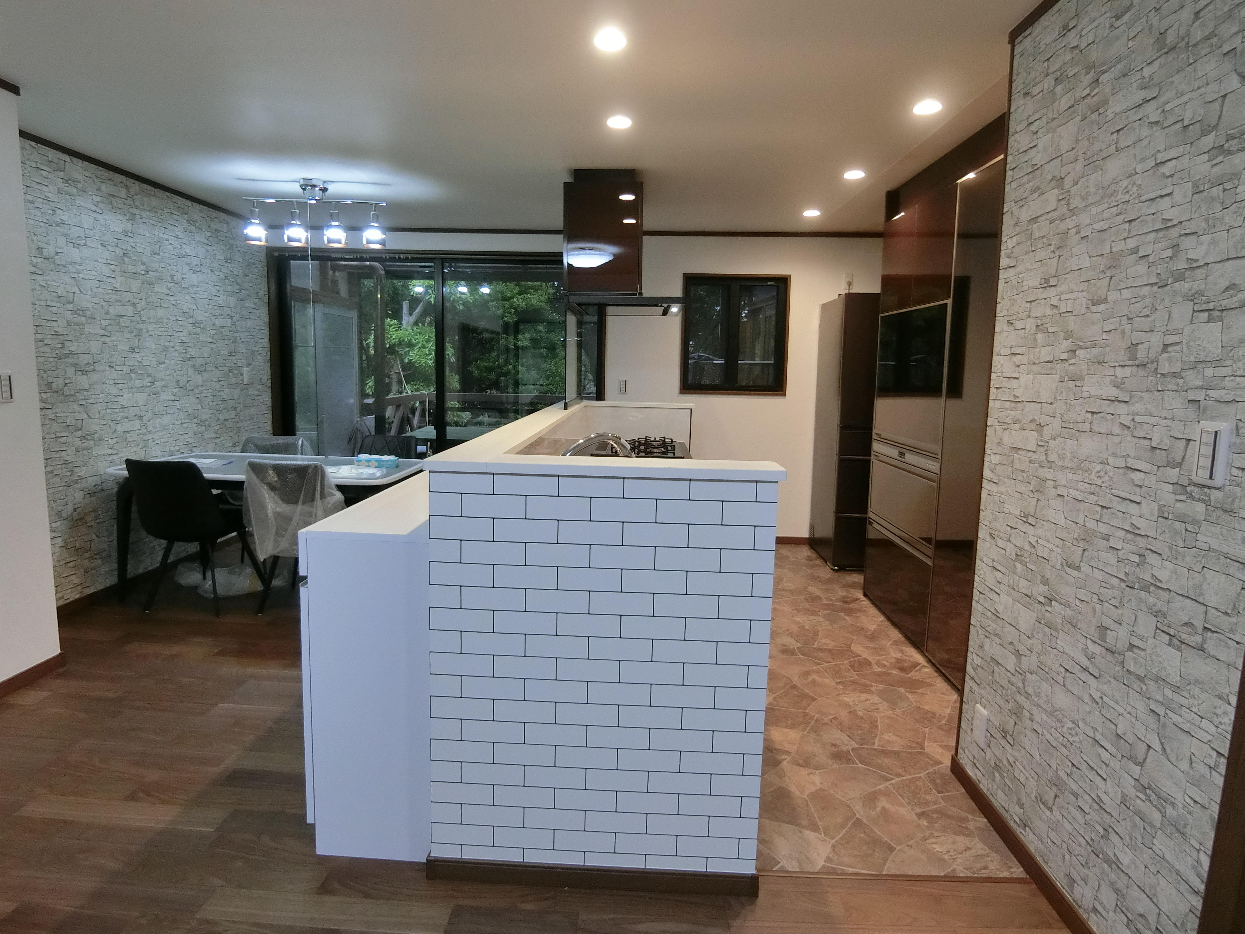 キッチンの位置はご夫婦だけの時も、ご来客の際でも使いやすい形でとのご希望があり、I型対面式で施工させていただきました。リビングからの景色も合わさり、とても素敵な空間になったと思います。