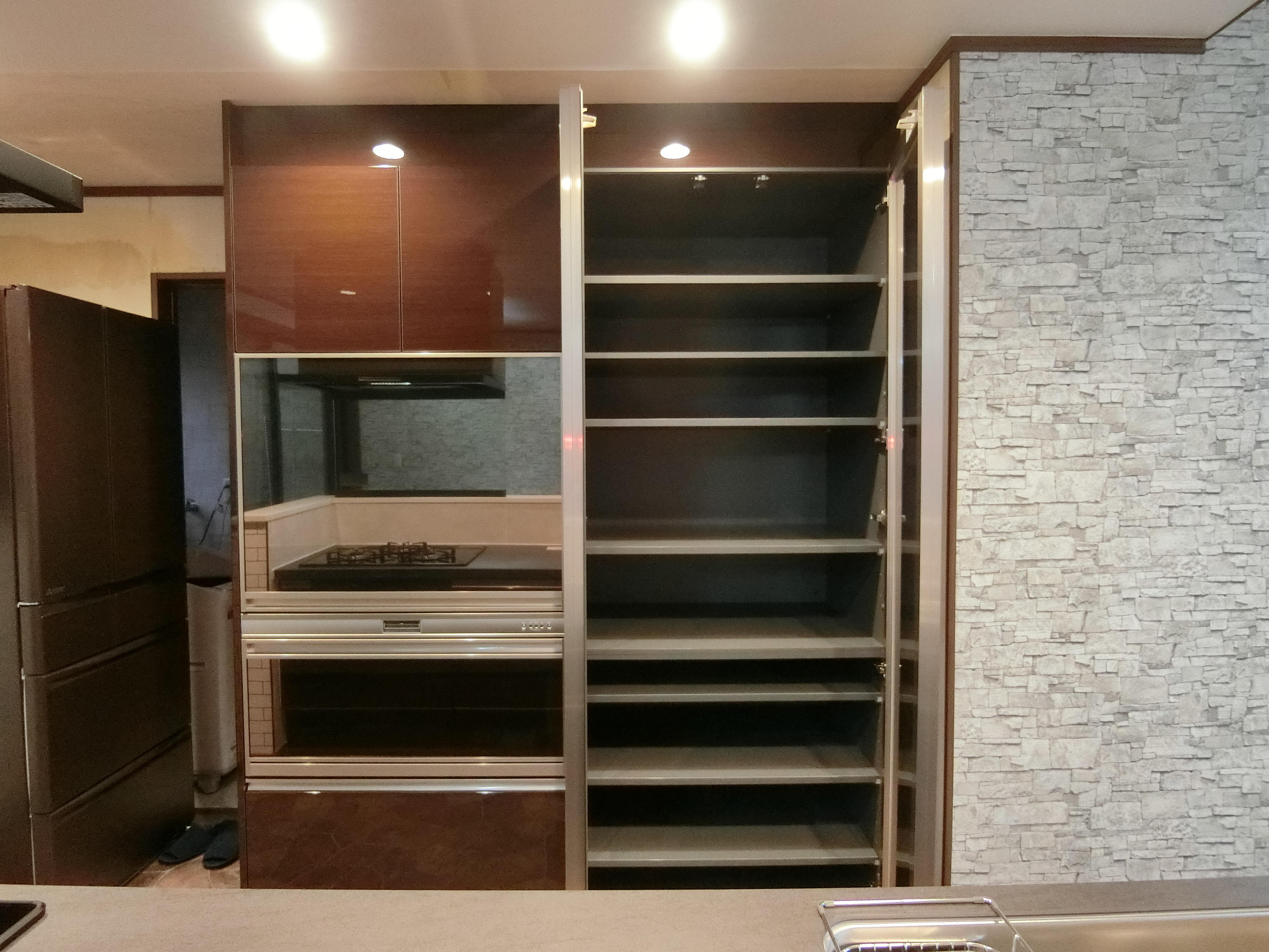キッチンの面材と合わせて鏡面木目のダークオークです。左側が家電製品を1箇所にまとめてしまえる家電タワーで、使用しない時は目隠しになるスイング扉になっています。右側が食器類をたっぷりしまえる奥行65cmタイプの収納棚です。