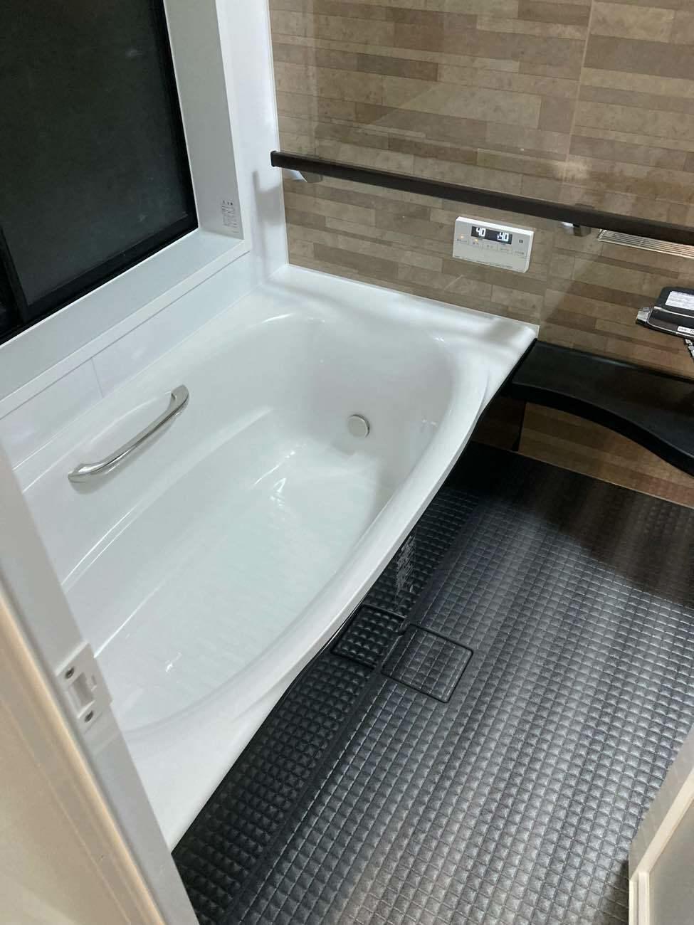こちらも石目を基調としたシックな空間になりました。撮影の関係で見切れていますが、手摺と収納棚が一緒になったスマートエスコートバーを取り付けています。(アライズ1616Kタイプですが、現在はモデル変更されています。)