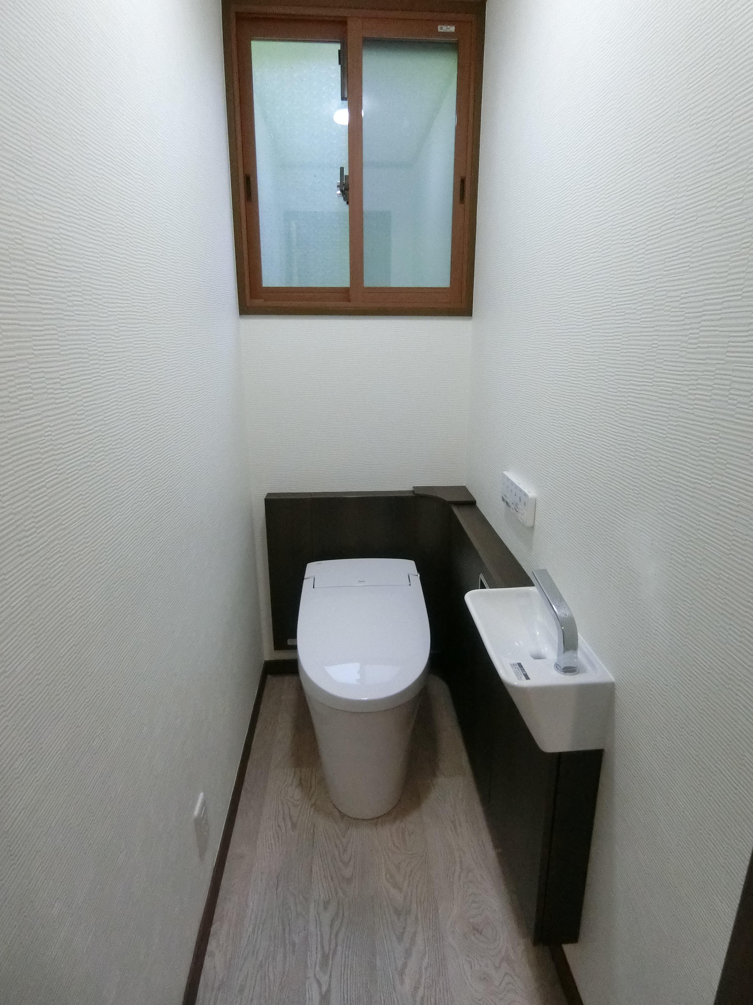 サティスSタイプ リトイレ手洗い器付きL型タイプ。給排水がトイレと一体になっている為、手洗い器側に給排水がなくても手洗い器が設置できるタイプになります。コーナー部にはトイレットペーバーが1つ収納できる形になっています。水栓はタッチレス水栓(選択式)になっているので自動で水が出てきて衛生的です。トイレ空間が寒いので、窓にはインプラスも取付ました。暖房器具等使用するために壁のコンセントを増設しました。