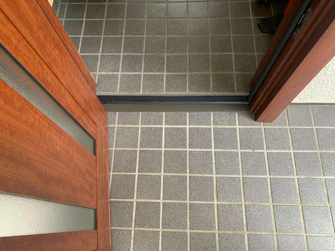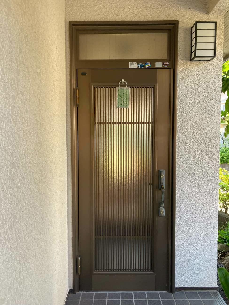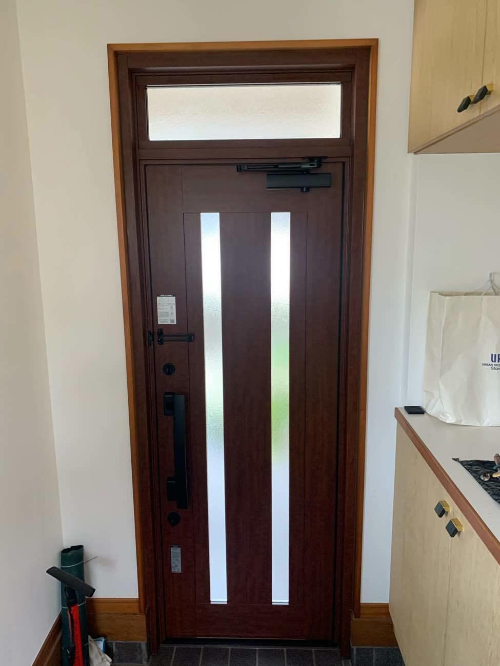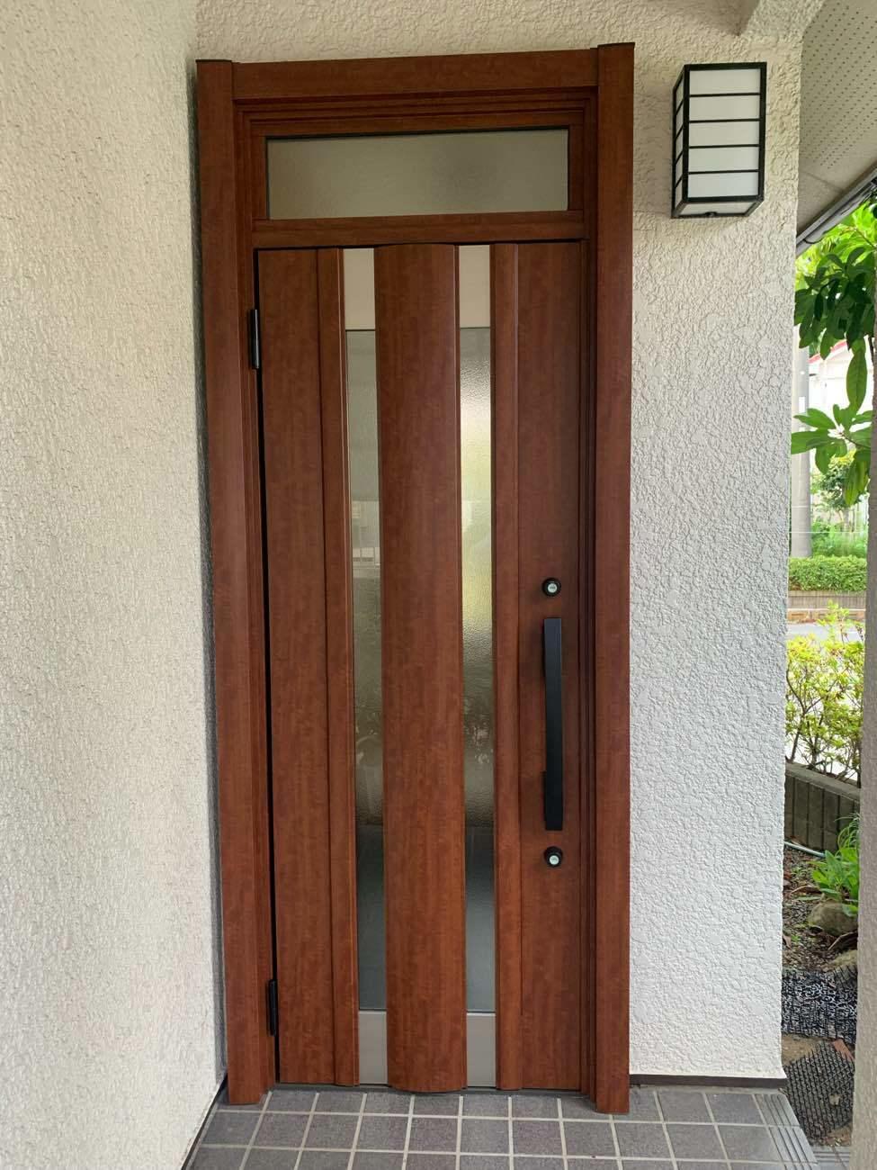 ドア枠が割れてしまい、まだ使える状態ではあったものの、ご心配で交換を決められたそうです。同じアルミでありながら、木目調なので重厚感ある仕上がりになりました。 商品 : LIXIL リシェント玄関ドア C14N型 色 : ポートマホガニー