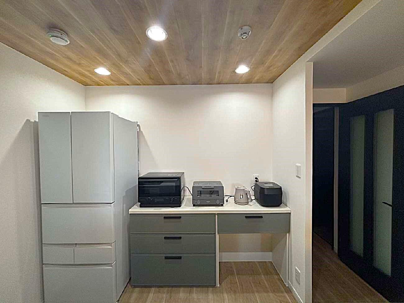 H様のご希望でキッチン収納をご依頼頂きました。 スッキリ見せるカップボードを設置し天井は木目のクロスをアクセントでおしゃれな空間に生まれ変わりました。