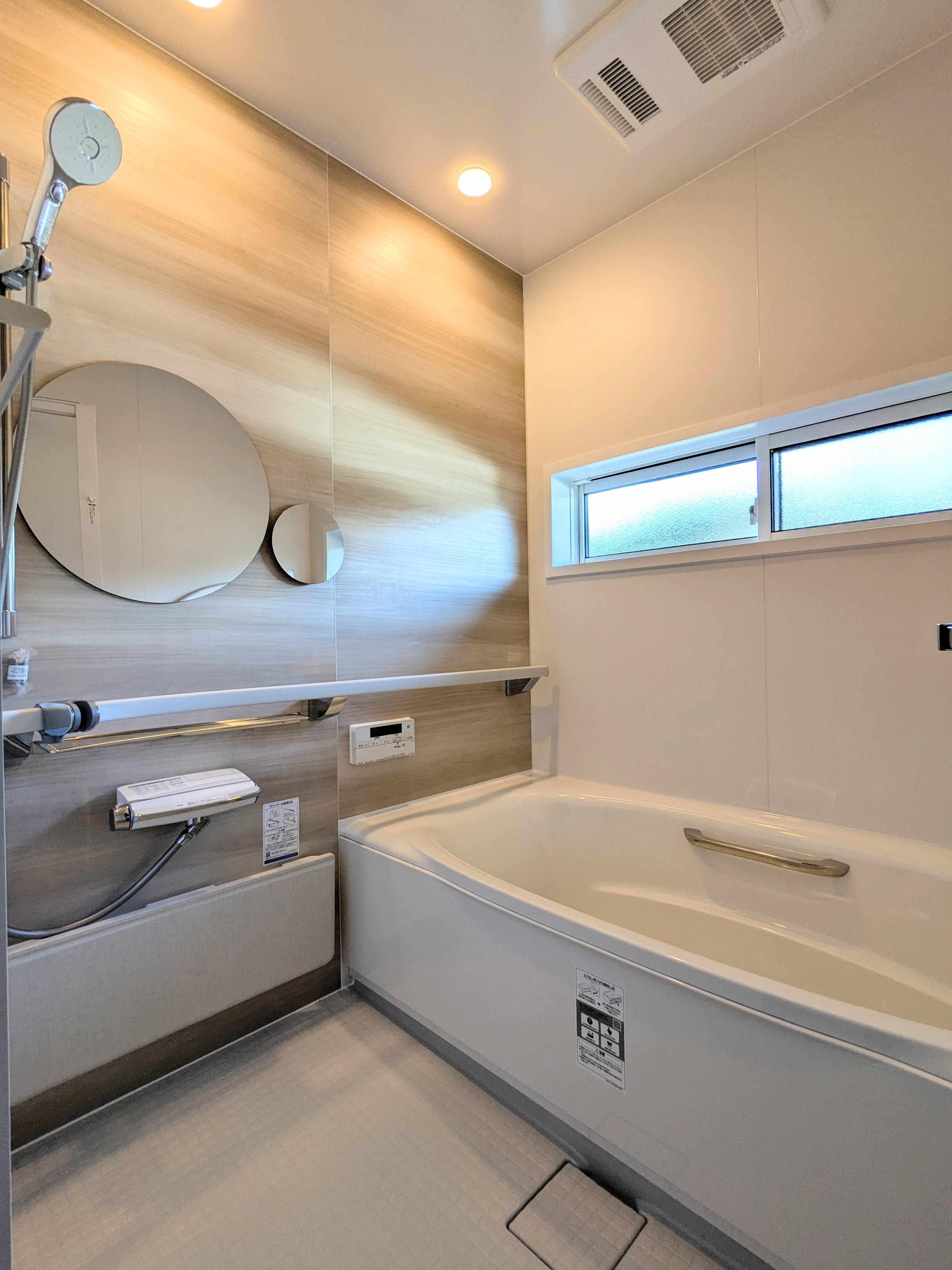 浴室交換とリプラスによる開口縮小工事で浴室の断熱効果も上がり、お選びいただいたパネルカラー、丸型のマグネットミラーによってモダンな浴室になりました。