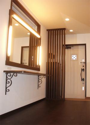 一点の鏡と埋め込まれた照明は、女優鏡といったところでしょうかまた、棚受けも味を出している金物にしました。