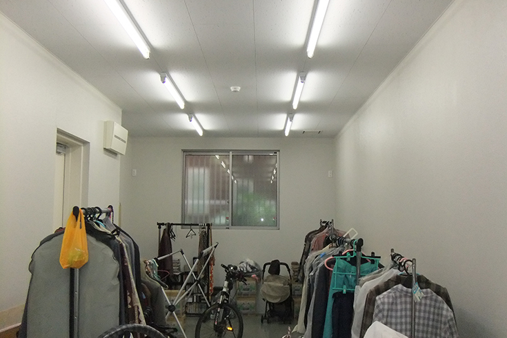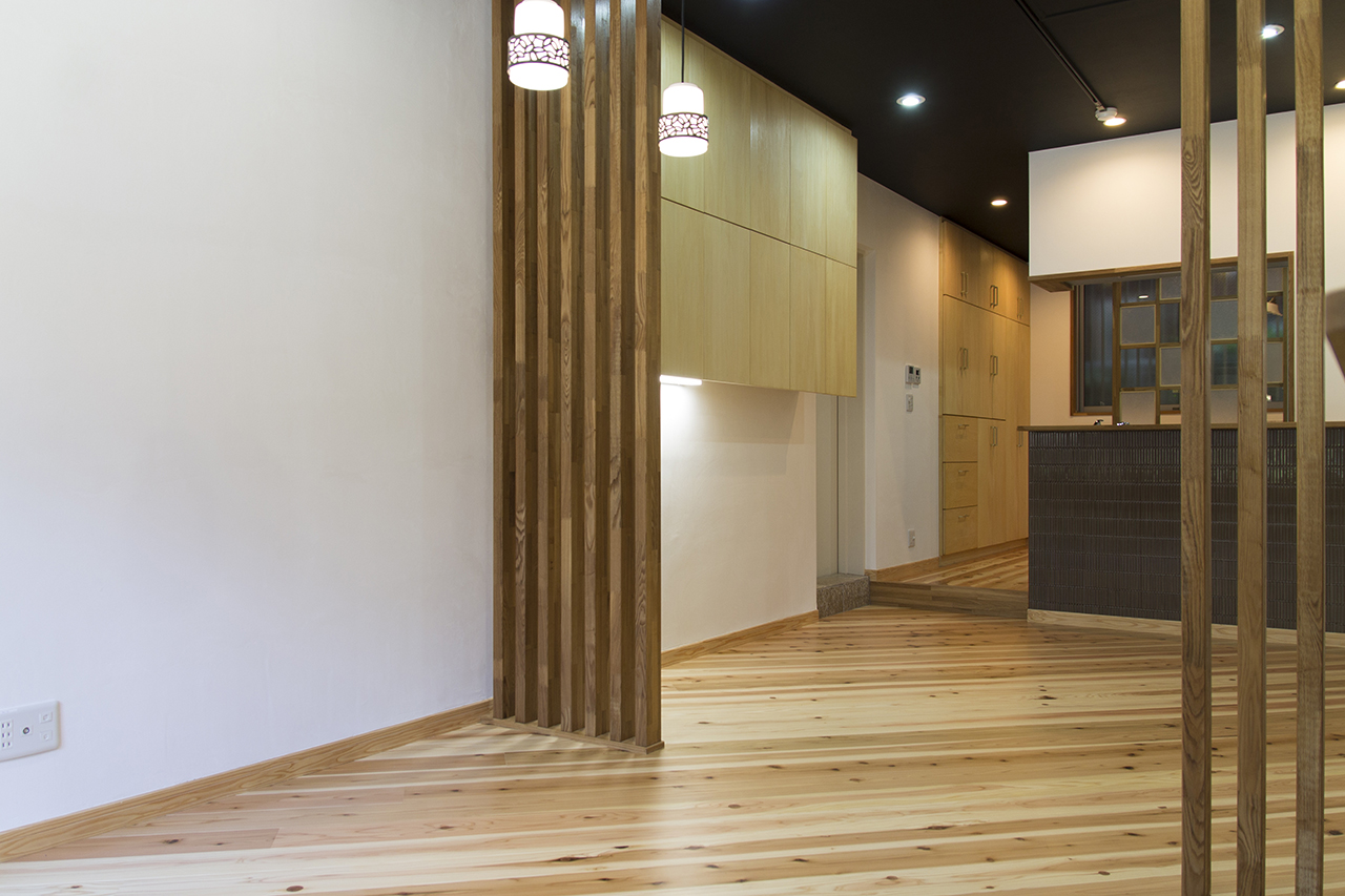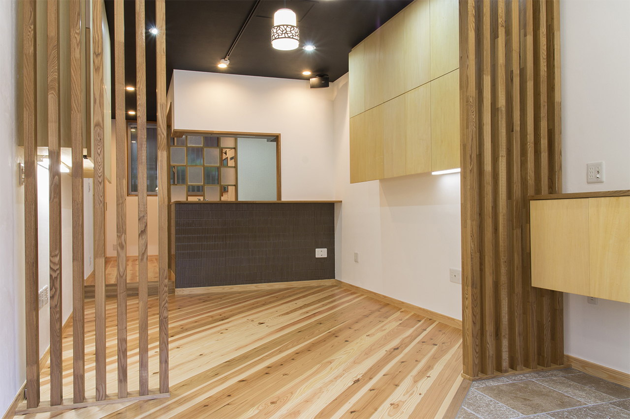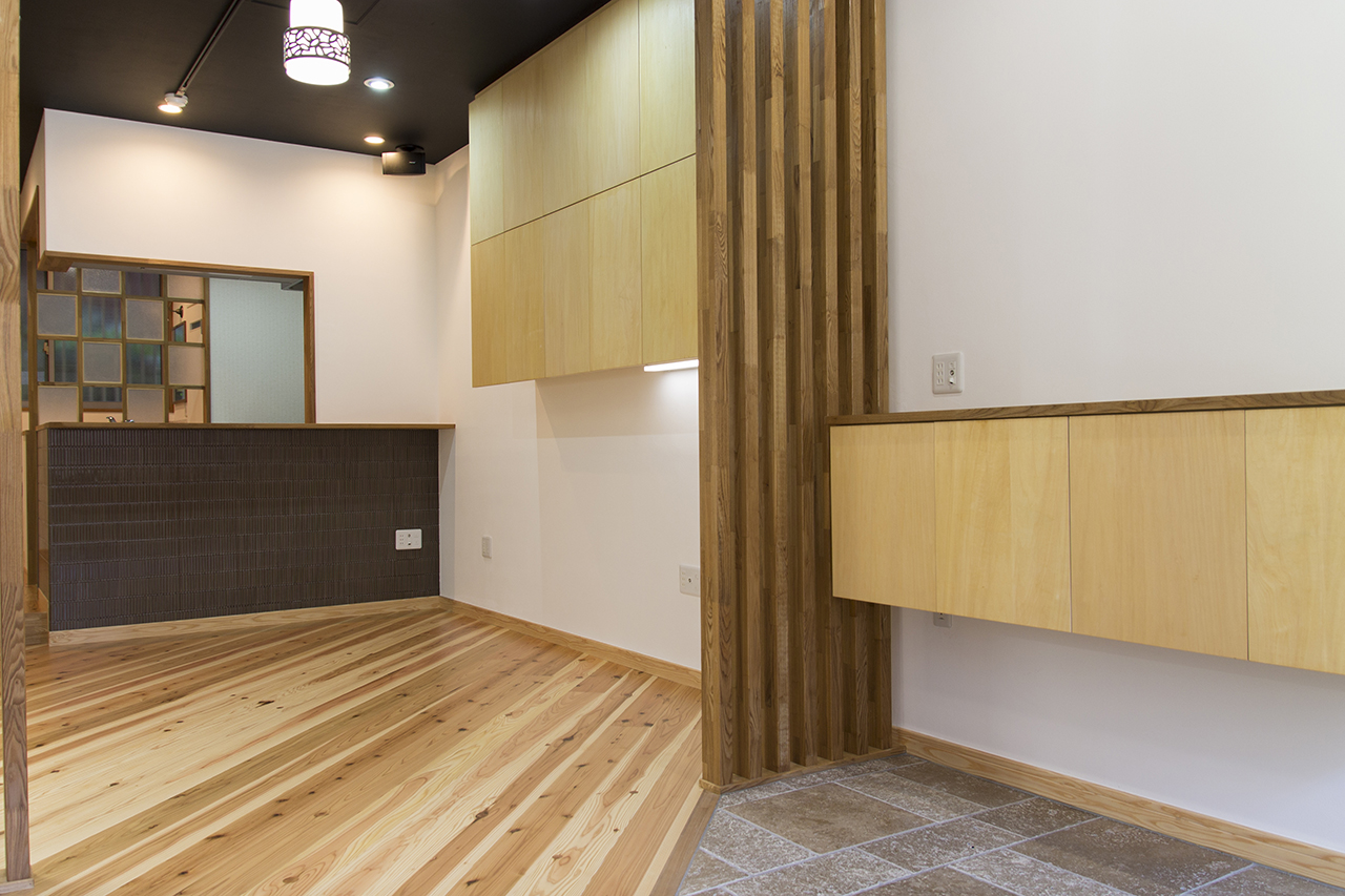 もともとは倉庫のようにして使っていたので、寂しい雰囲気でしたが、素材にも気を使って床は杉の無垢材にして自然素材を活かした、あたたかみのある雰囲気作りを目指しました。また、部分的にタイルや石等の異素材を使ってアクセントをつけました。 壁は珪藻土と天井は臭いや湿気を取ってくれるバリアヘルスコートという炭を使った塗料をあえてそのまま黒い天井に。細長い間取りなのでフローリングを斜めに貼ることで、部屋に広がりを持たせる工夫をしました。事務机を設置する場所の吊戸棚下には照明を設置し、事務作業の際の照度不足を補います。