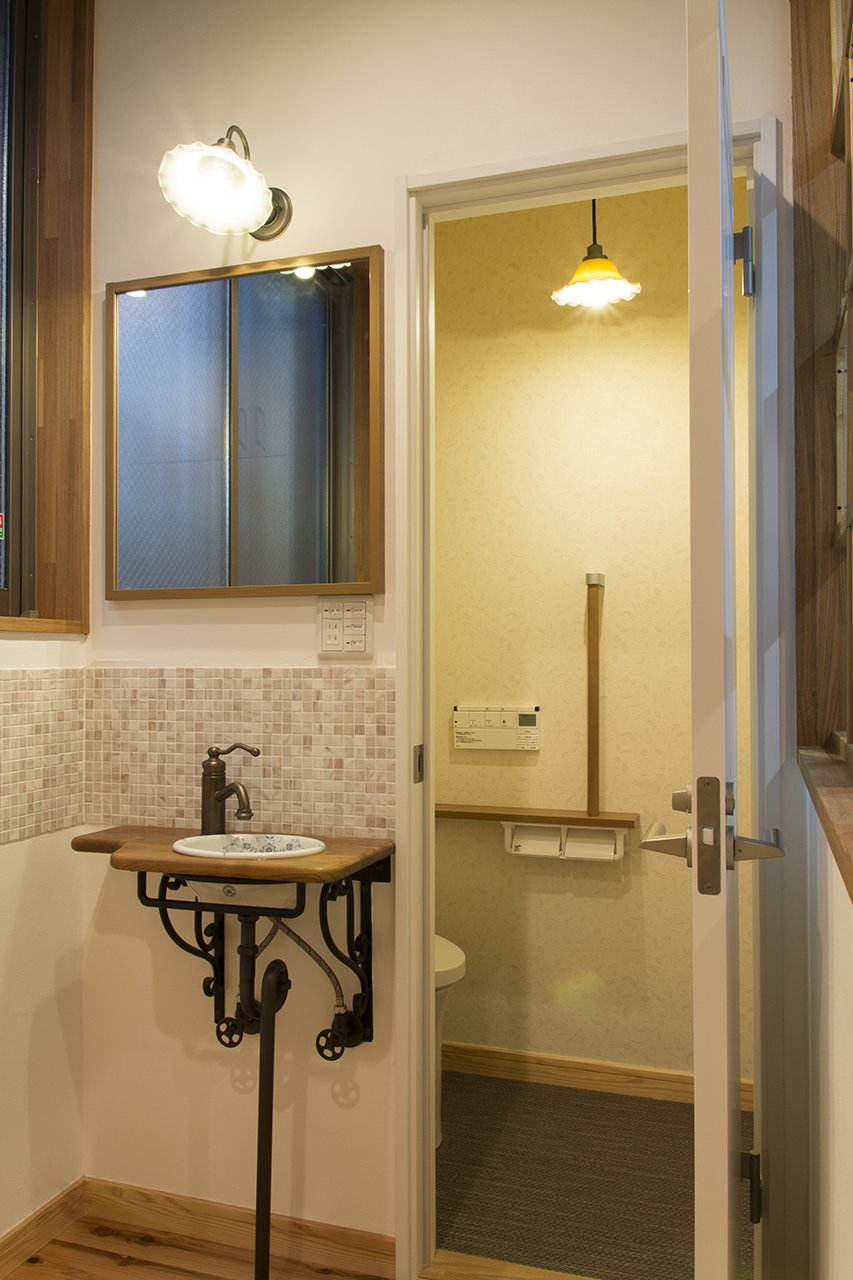 手洗い器はクラシカルなものを。周りには水はね防止でモザイクタイルを貼って機能性とデザイン性を持たせました。トイレとおそろいの照明がポイントです。