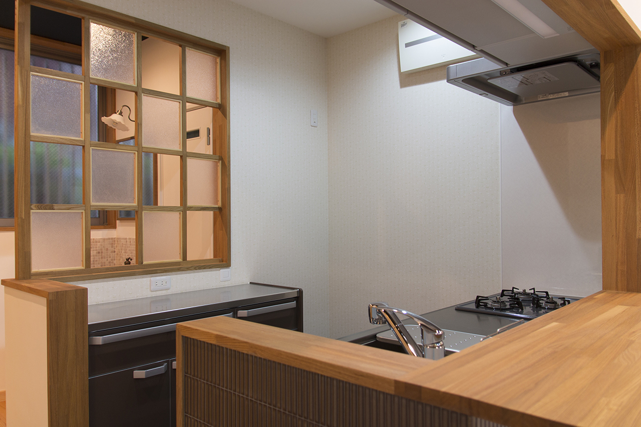 キッチンの裏はトイレなので、目線を隠しつつ光と風が通るように、所々にデザイン性のあるアクリルパネルをつけました。