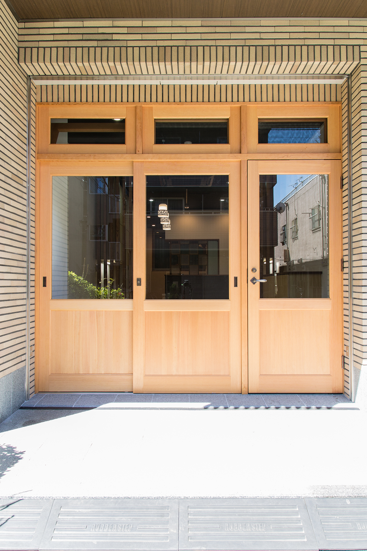 ファサードのサッシュは、お施主様のこだわりでもあった木製扉で、一から造ったオーダー品。欄間を開けて風を取り込むことができる様に設計・制作いたしました。外側に網戸を配し虫などの侵入を防いでいます。取手や丁番も真鍮のもので、質感からデザインまでこだわって決めていきました。