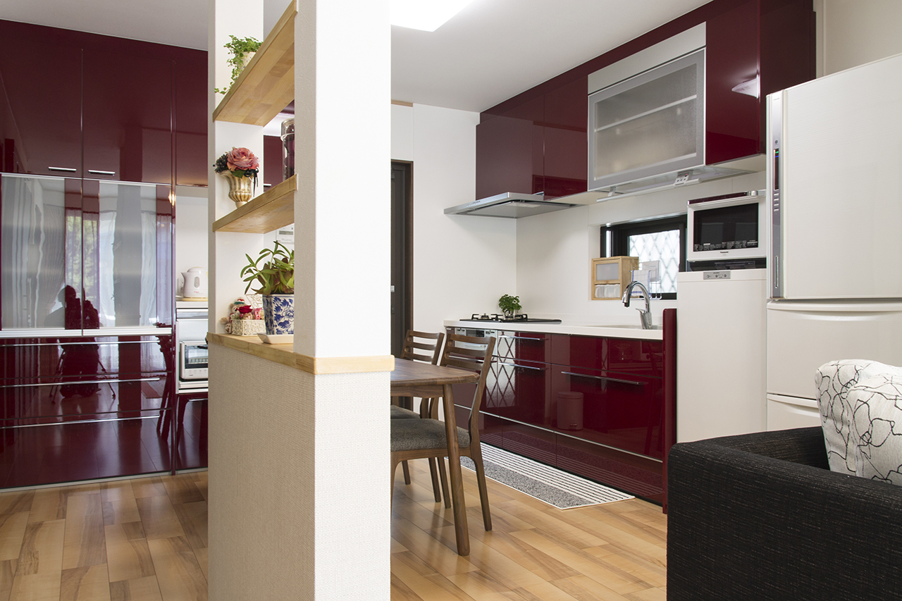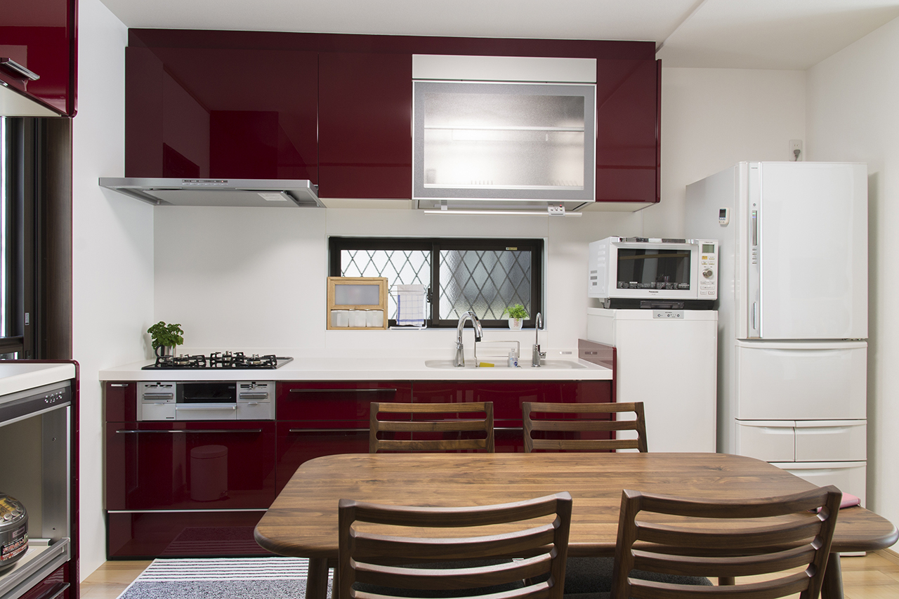 キッチンはLIXILのリシェル。 「キッチンを広く使いたい」というご要望から対面キッチンにはせずに、ダイニング部分を囲う様にシステムキッチンを配しましたが上手くまとまったと思います。ディープレッドがアクセントにもなりキッチンに立つこともテンションが上がります。