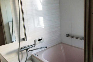 ユニットバスには木目のアクセントが効き素敵な空間に。手摺もついて安全安心の浴室になりました。