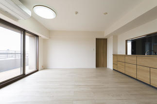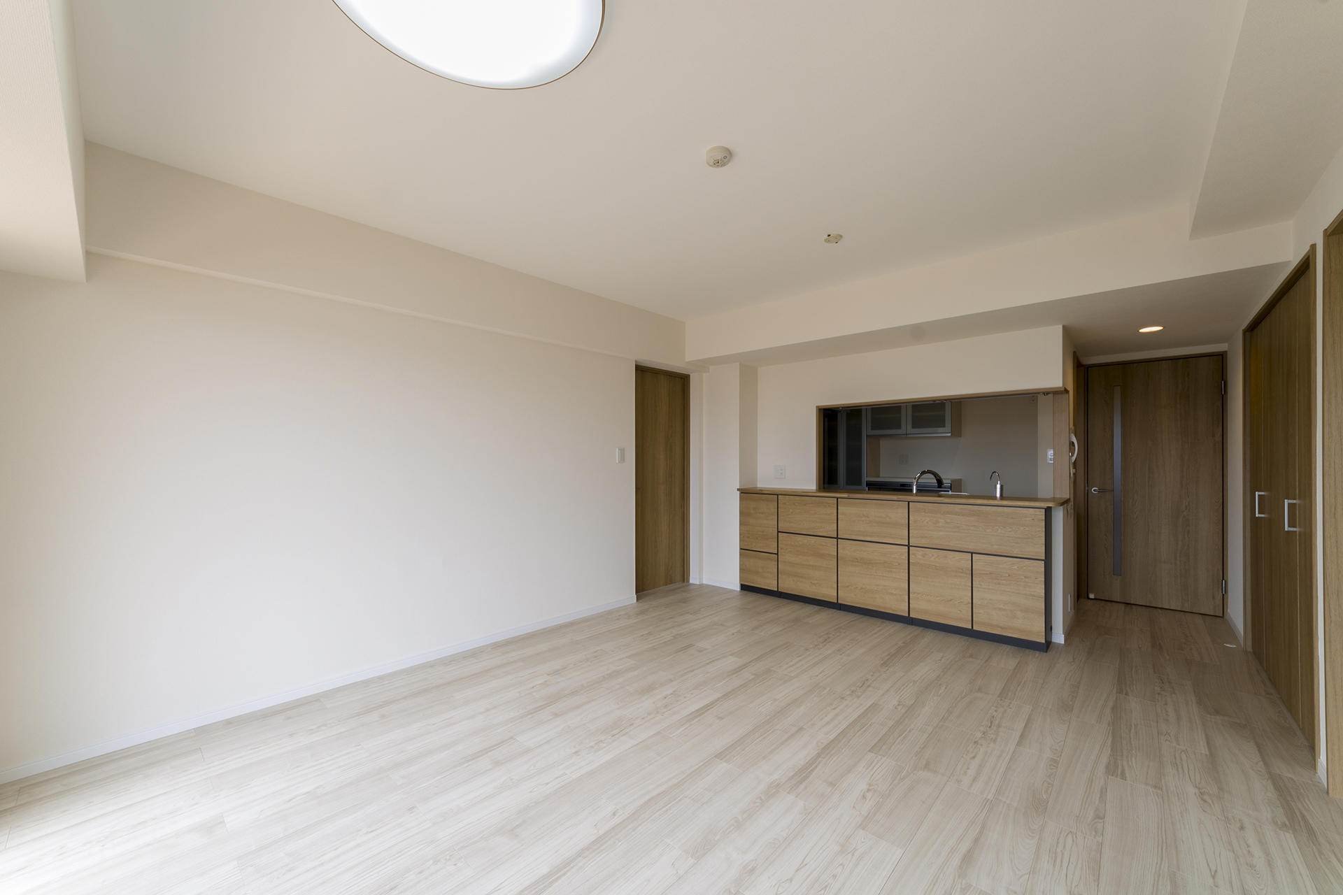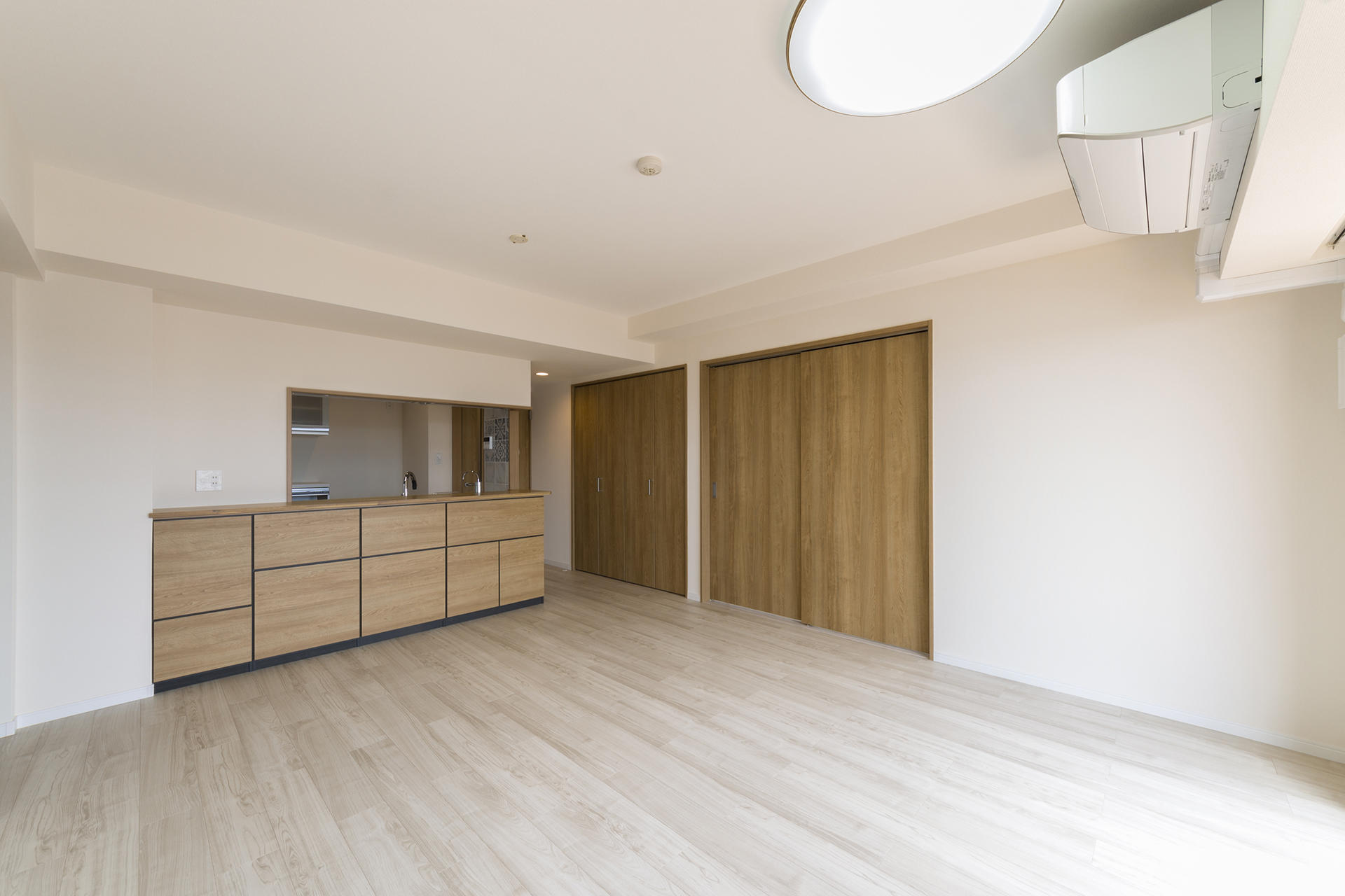 チェスナットのフローリングと、オークのドアや収納で明るく広々としたリビングになりました。