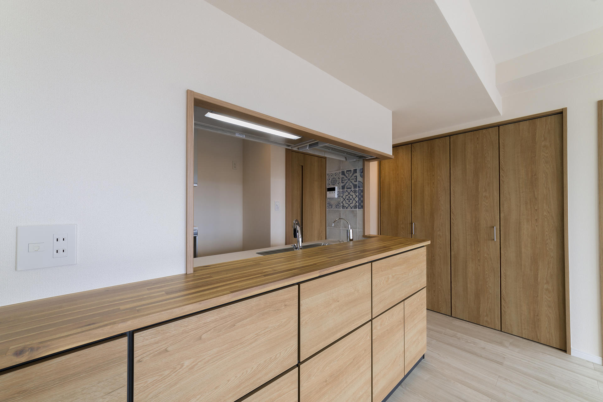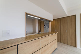 キッチンからリビングへの開口を広くして、明るいダイニングとしました。カウンター下にはすっきりした収納を取り付けました。収納量も十分です。