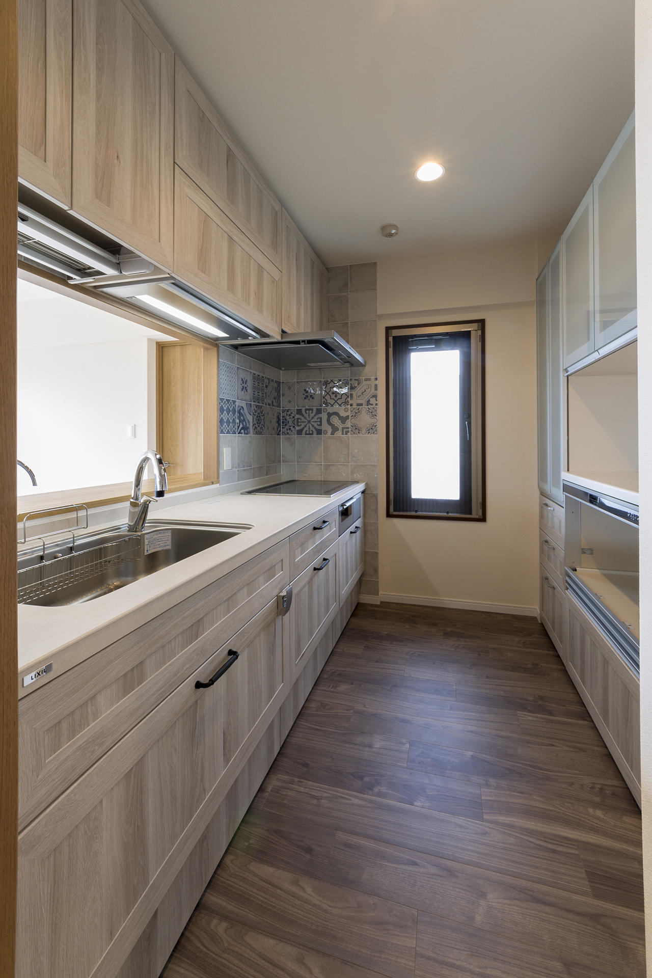 木目の美しい落ち着いたキッチンはLIXILの上級グレードのリシェル、壁にはタイルを施工しデザインにもこだわりました。防水・耐火の機能も備えています。