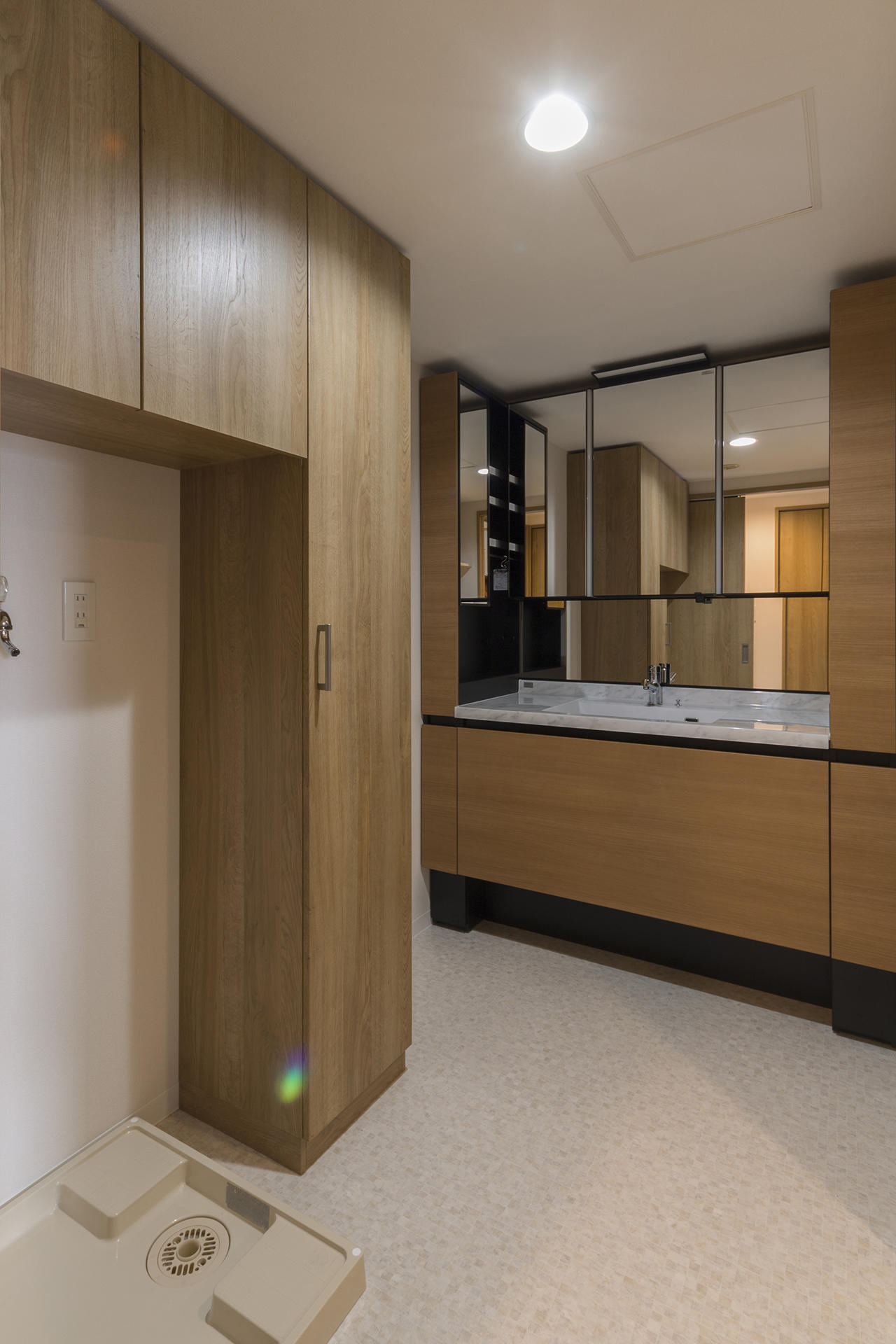 LIXILのルミシスと壁収納で収納力が大きくなり、ドレスアップのための明るい空間となりました。洗濯機置き場も収納力を高めすっきりした空間になりました。