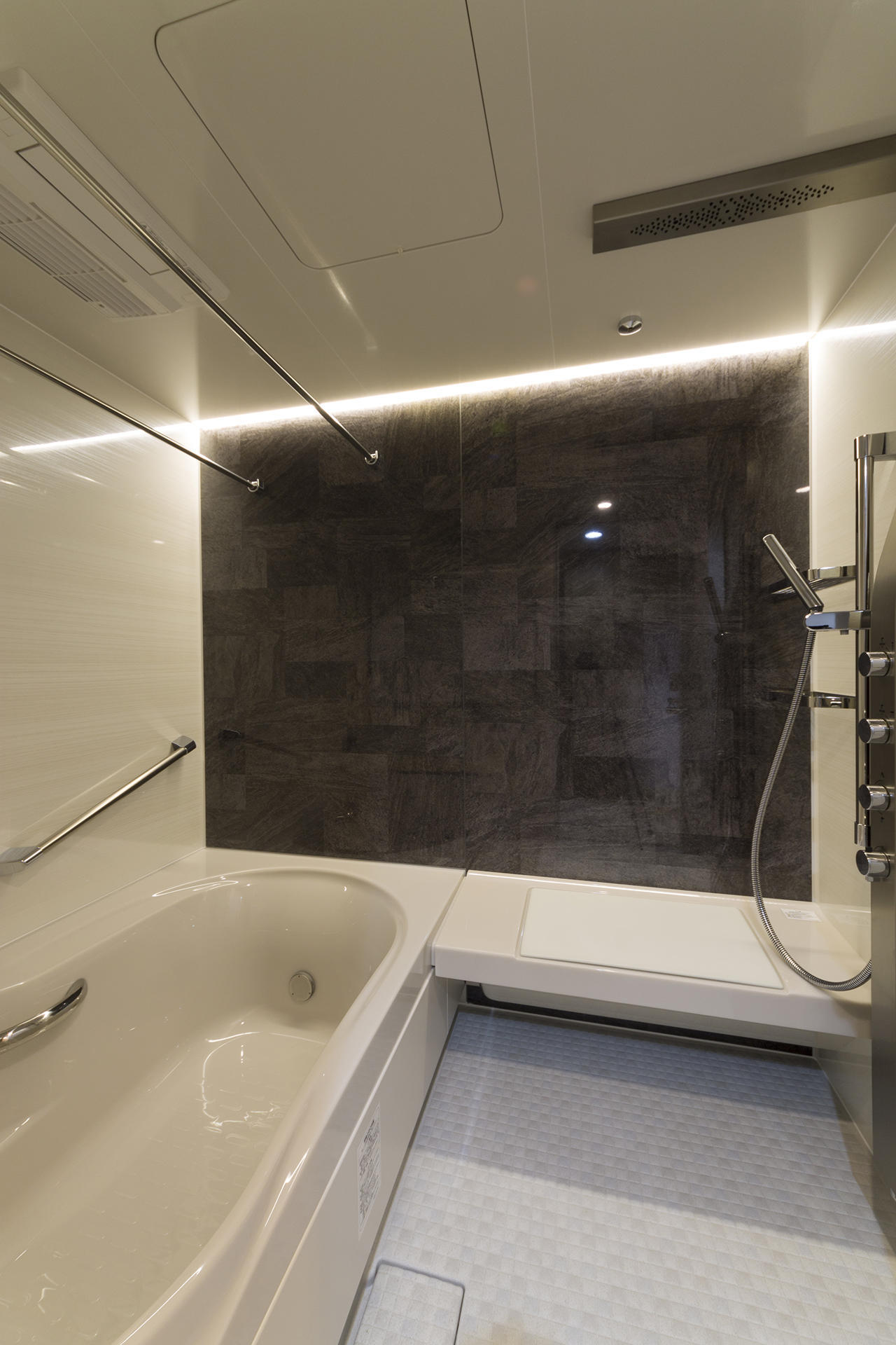 白をベースの組石グレーのアクセントパネルを使用したデザインで大人の雰囲気を出しています。「ジェットバス」や「天井からのシャワー」や「打たせ湯」などの機能が充実した高品質の浴室は家の浴室をSPAにしよう!がテーマのLIXILのスパージュです。間接照明のライン照明は調光も出来ますので雰囲気に合わせてバス空間を変えられます。