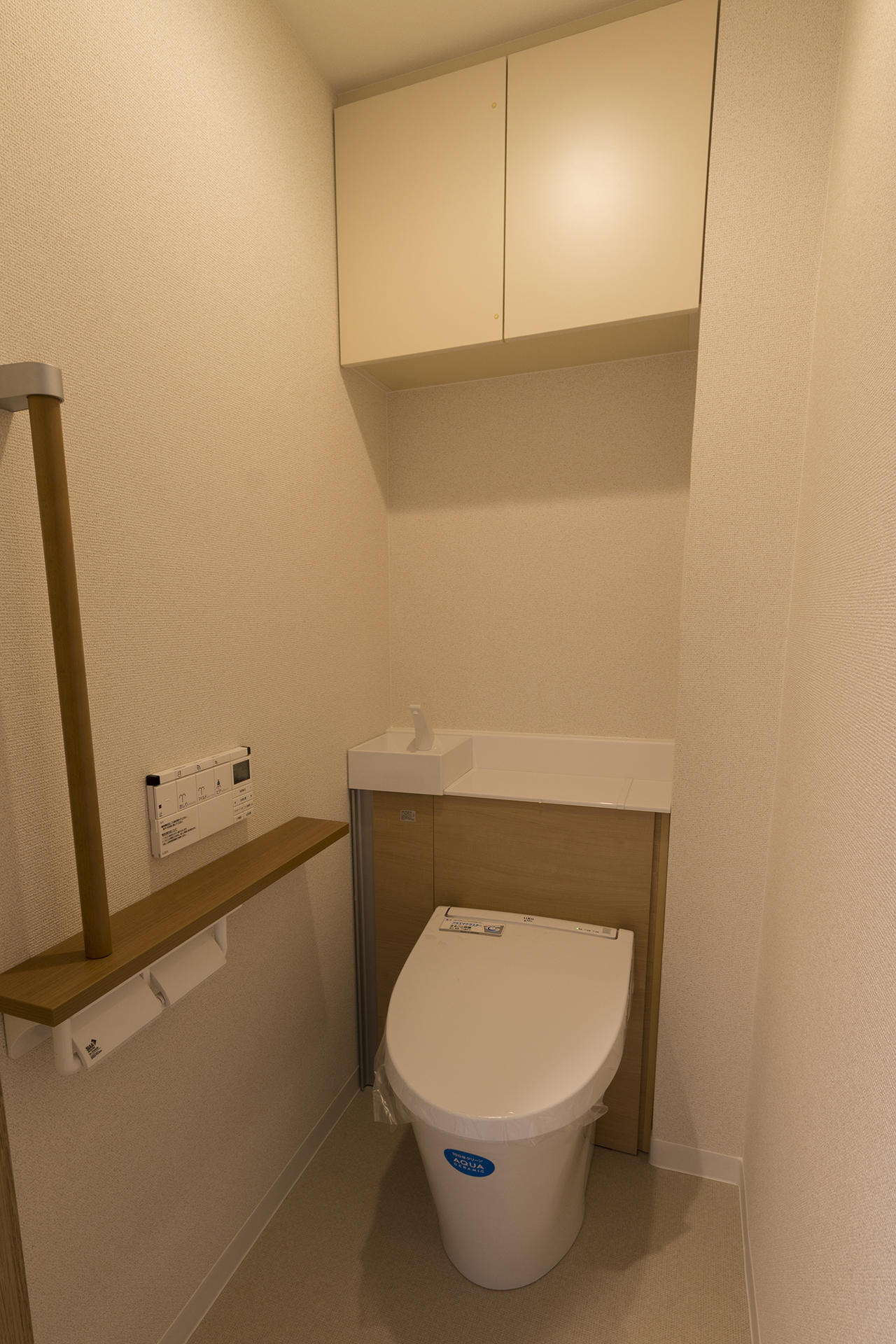 トイレはLIXILのリフォレ。トイレの両サイドは収納も兼ねてトイレ空間も物が散らからないすっきりとした空間になりました。手摺も完備し、安心です。