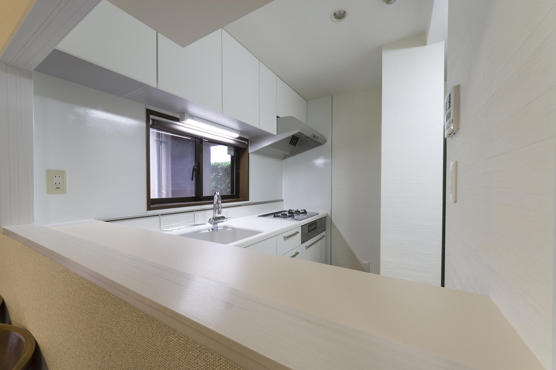 人工大理石の天板・キャビネット・収納棚を白で統一しました。ワークスペースも広くしたので、今までより広く明るくなりました。