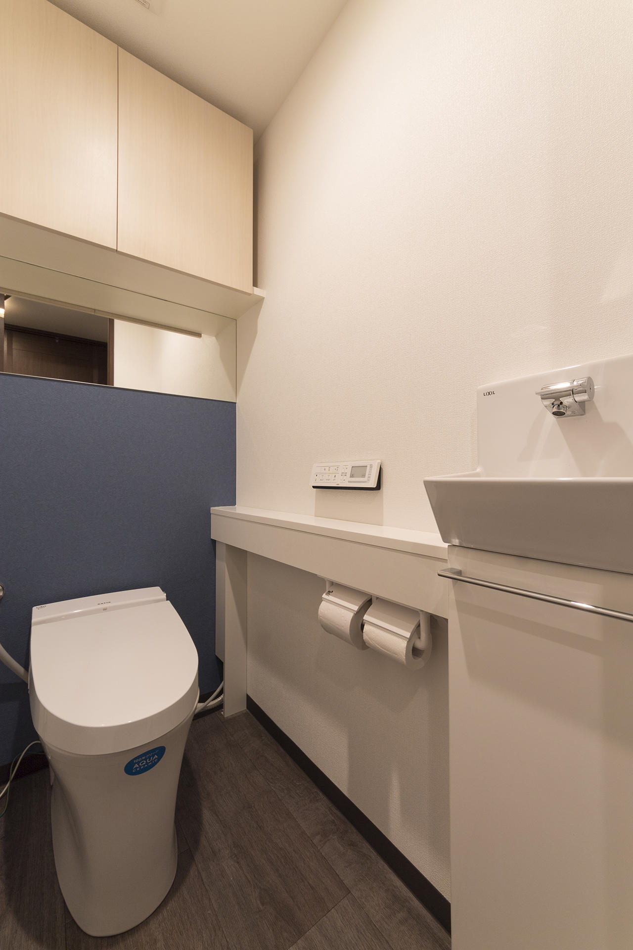広めの空間を生かして手洗いカウンターを設けました。 床は木目を生かしたナチュラルな雰囲気とし、正面にブルーグレーの壁紙でアクセントを付けました。