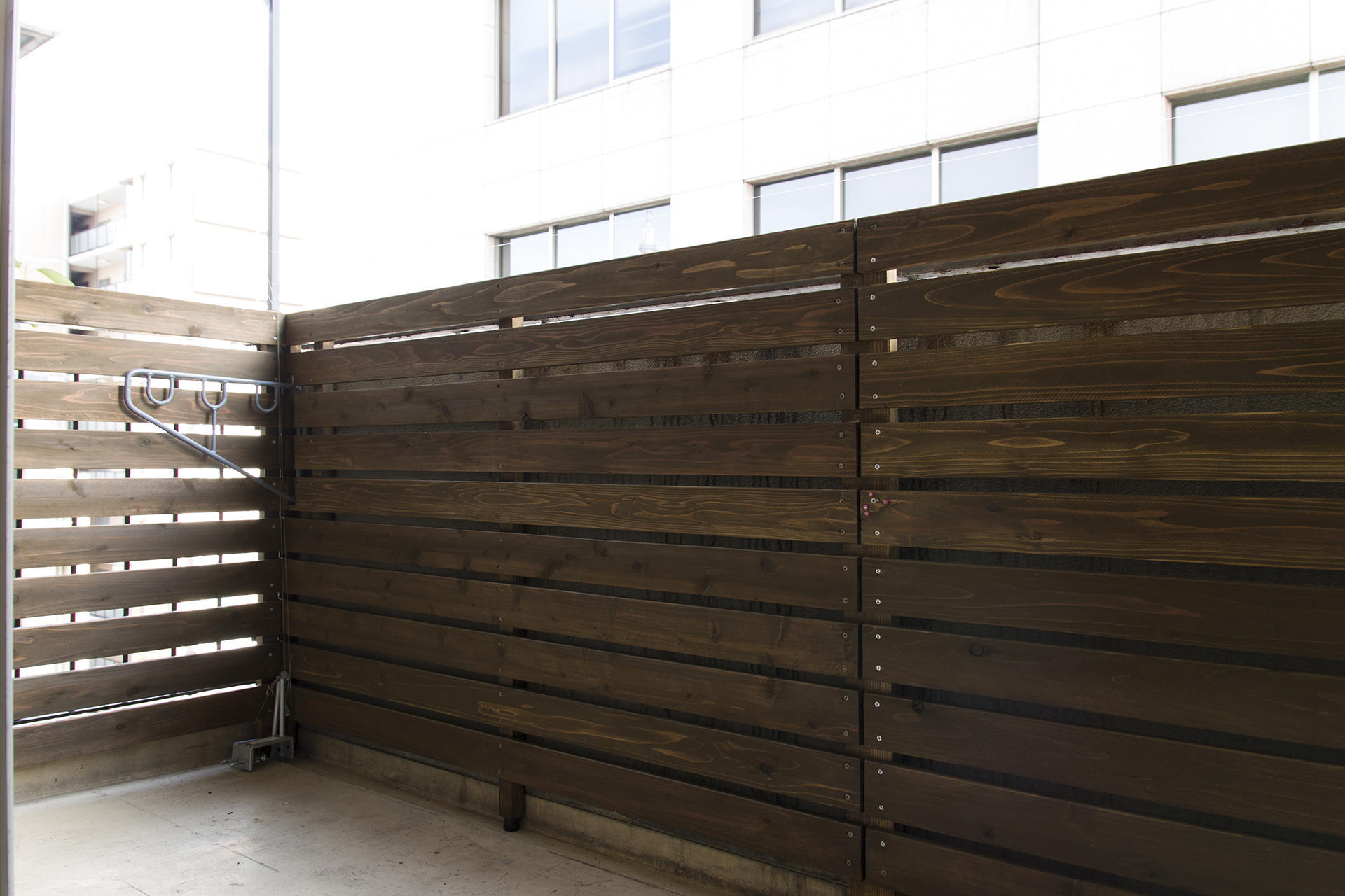 背の高いビルがある中、プライバシーと見た目を気にしていました。板のフェンスでプライバシーを確保、また、木を用いたことで温かみが増した素敵なベランダになりました。