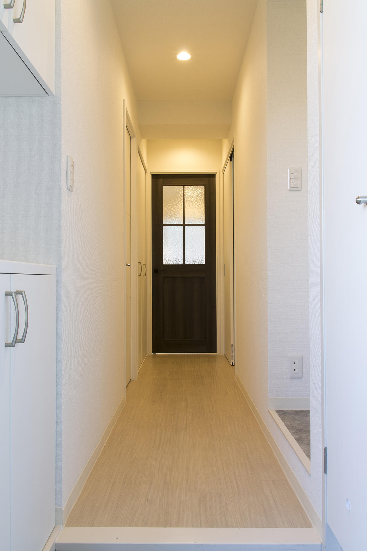 前は光も差し込まず暗い空間でしたが、玄関を開けると光の入る玄関ホールになりました!ヴィンテージ風の入口扉がGood!