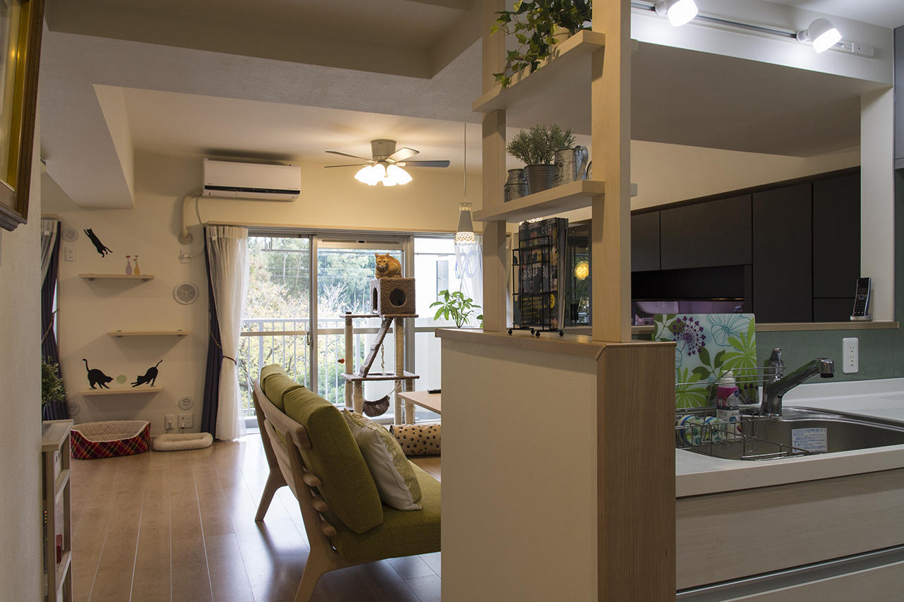 廊下にあたるスペースとの境には目隠しが欲しかったのですが、閉鎖的にならない様に飾り棚を設けて目隠しとして使っています。外の景色を眺めながら、ご家族や猫と対話をしながら対面キッチンでお料理をしています。