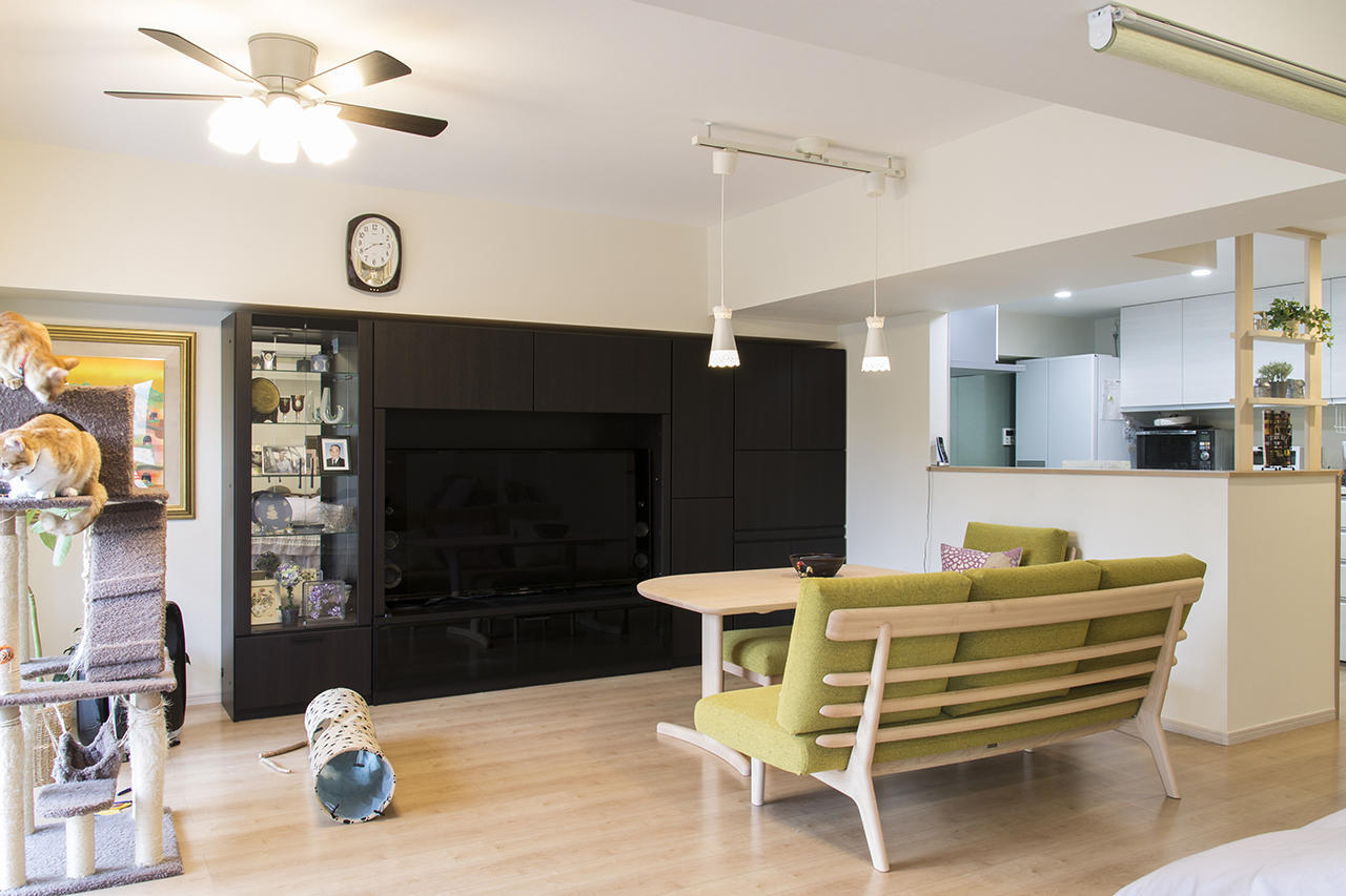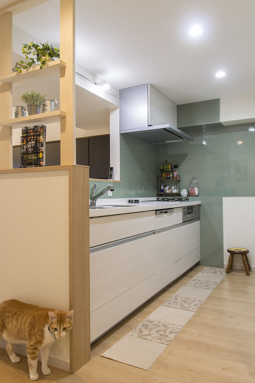 この度はウッディホームをお選び頂き、有難うございました。猫ちゃんもキャットウォークを楽しんでいただけているようでホッとしました。グリーンな落ち着いたキッチンからも猫ちゃんたちを見守れる空間になり今以上に距離も近づいていただけると思います。築年数の経っているマンションはどうしても断熱性に欠け、結露などに悩まされていましたが、外部に面する部分に断熱施工を施し、省エネ住宅にもさせて頂きました。今後も何かございましたら、ご用命ください。