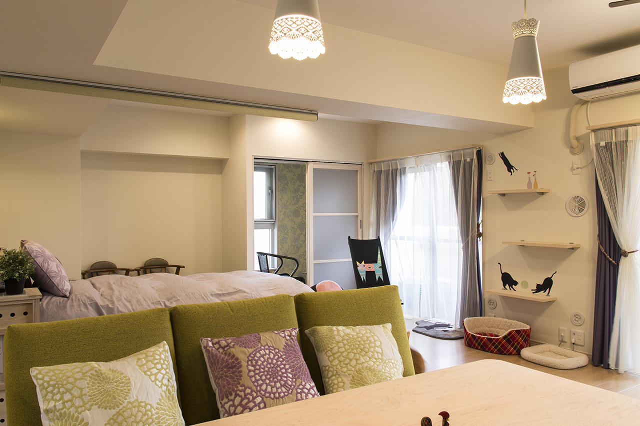 中央奥にある1帖分のスペースが、ご主人様用の「喫煙スペース」。ご近所迷惑に配慮し、猫たちにも嬉しい奥様たってのご要望でした。LDKの中に「この方が家事がしやすい」という奥様用のベッドを置いています。来客時などそのままではちょっと困るのでスライドするロールスクリーンを下ろし、パブリックとプライベートを分けることができるようにしました。