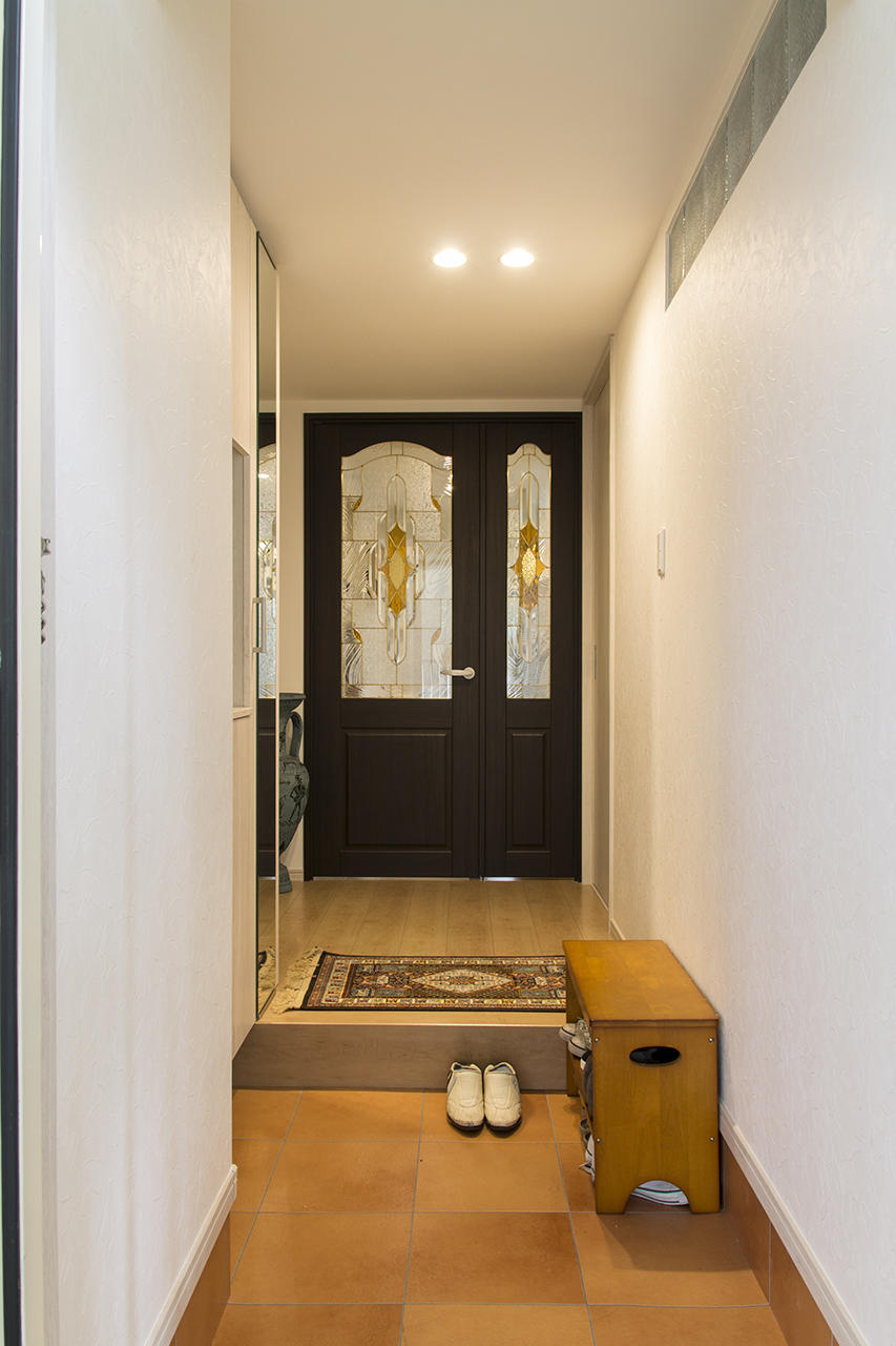 玄関土間はタイル調のフロアに変更、廊下を仕切る扉は通路幅を広くしたことからステンドグラス調の瀟洒な親子扉に。洗面や娘さんの部屋への扉には猫用の小さな扉もついています。天井近くのガラスブロックで室内からの明かりを取れますが、玄関ははこれで十分明るいようです。