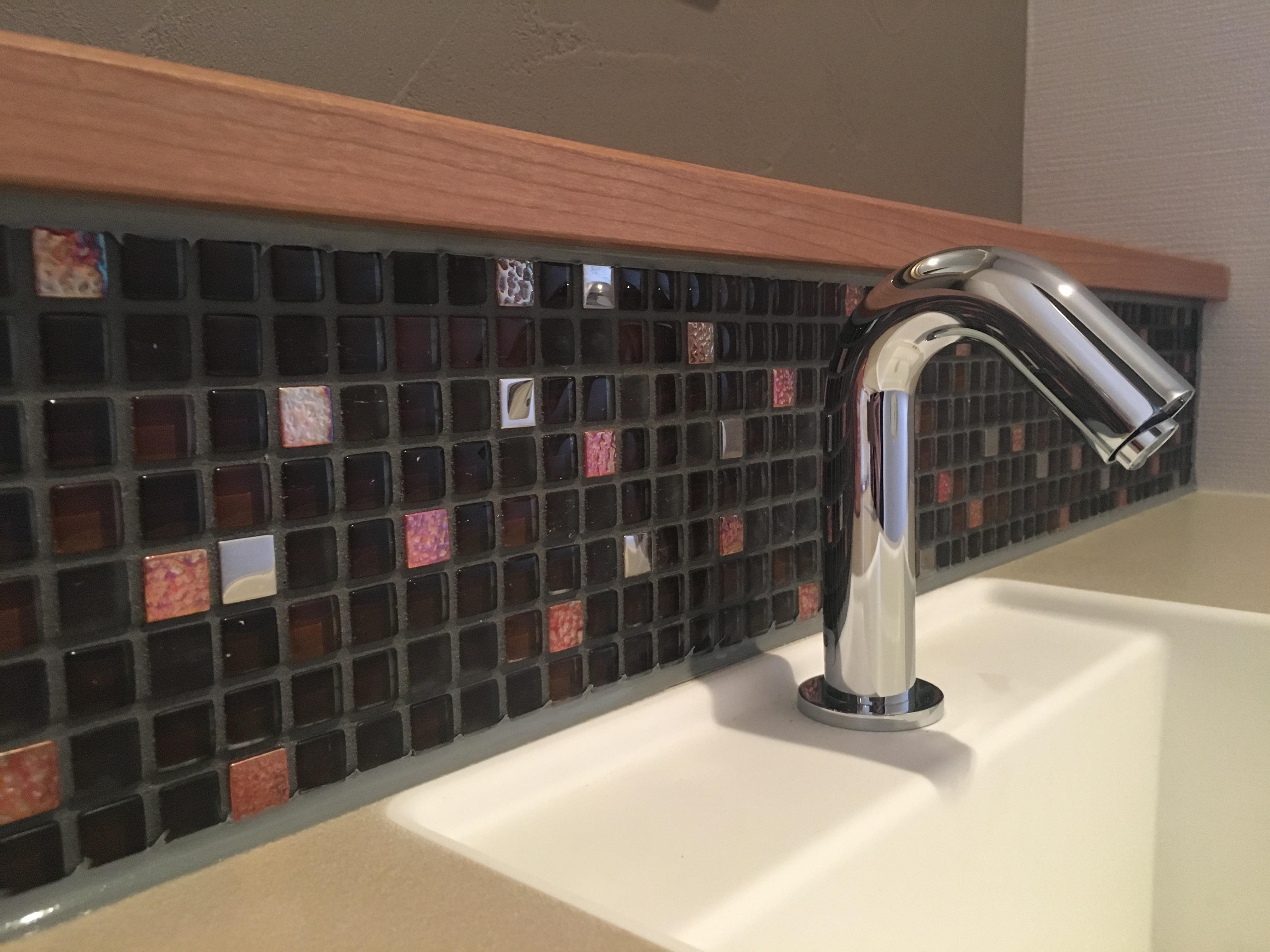 トイレの床材はセラミック製のハイドロセラを貼ることにより清掃性のアップと豪華さと明るさをプラスできました。洗面化粧台、トイレの手洗いどちらも自動水栓を採用することにより、より衛生面も向上しました。ご提案させていただきお選びいただきましたモザイクタイルやアクセントクロスも気に入っていただきとても嬉しく思います。