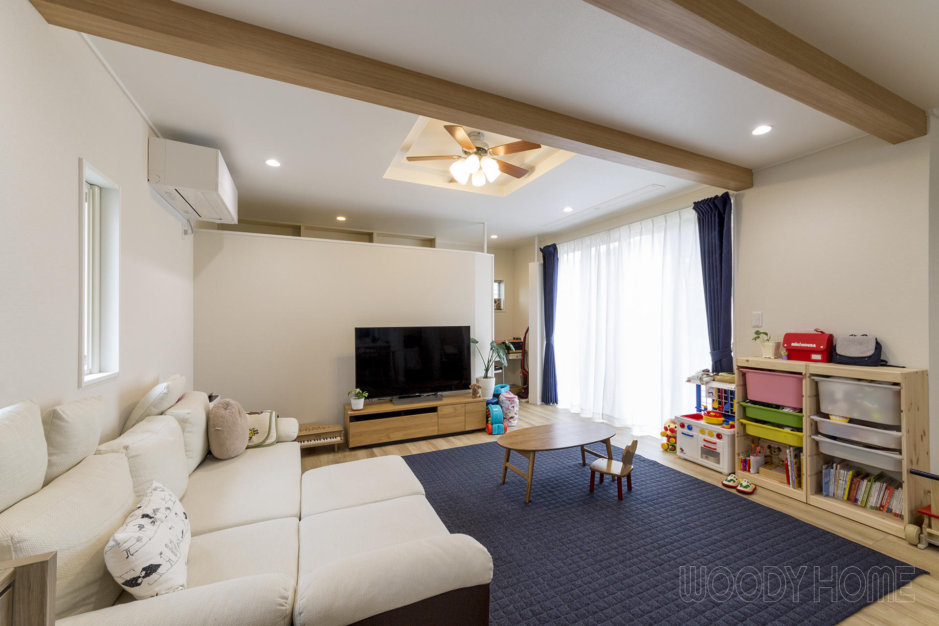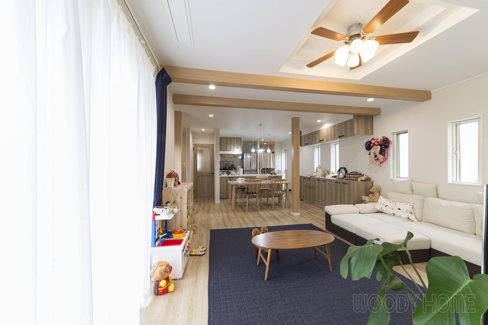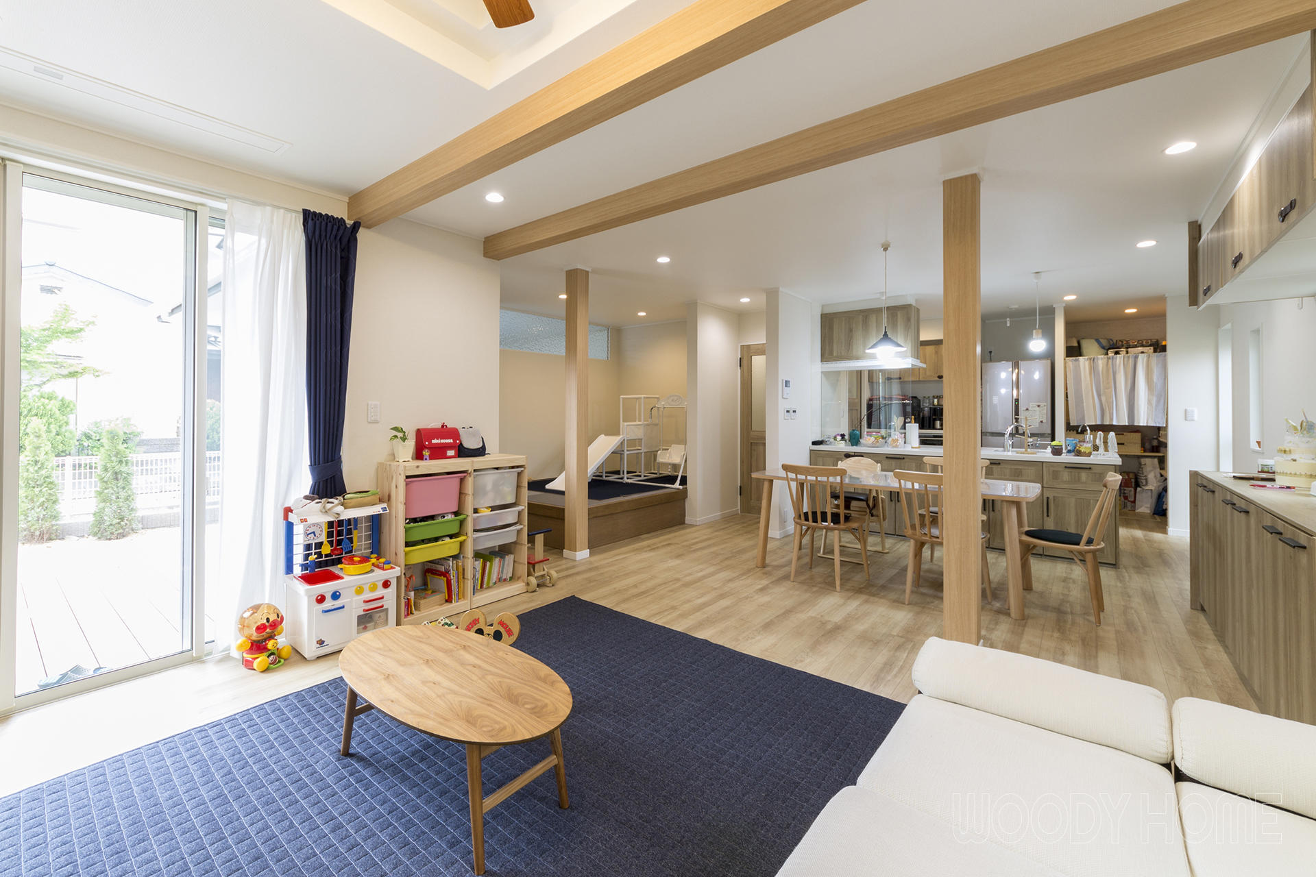 リビングからダイニング・キッチン。ウッドデッキ側は掃き出し窓、反対(東向き)側は採光とプライバシー保護を考えて窓を配置しています。床暖房敷設で冬は足元から暖かくなるのもいいですね。