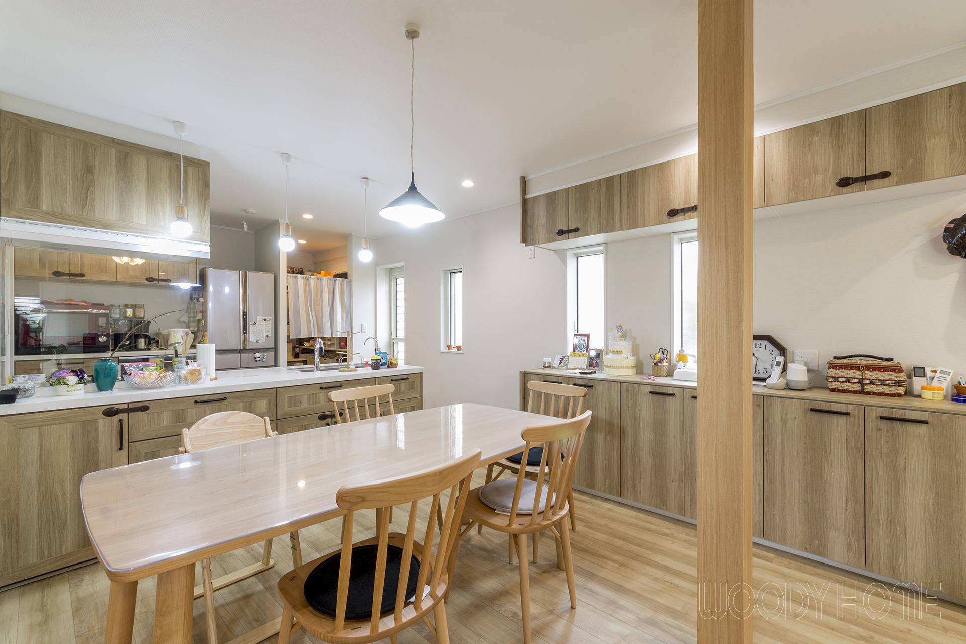 ダイニングにはシステムキッチンと同じLIXILリシェルのバックカウンターと吊戸を設置。上下に分けられた収納は小物から大きめのものまで仕訳けられる収納量の多いダイニングです。整理上手になること間違いなしです!