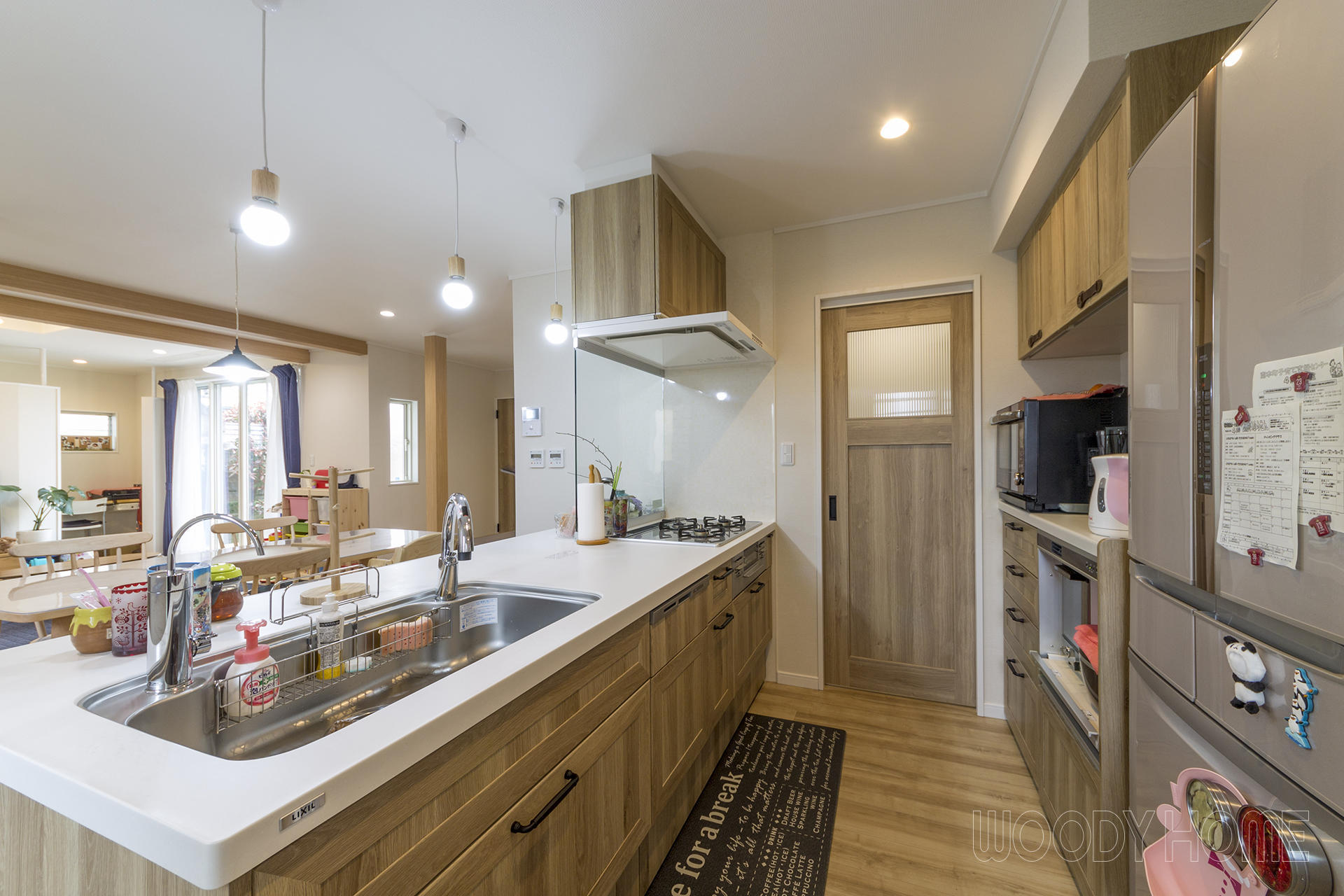 二列型を半島型(ペニンシュラ)レイアウトで設置されたキッチンはLIXILのリシェル。対面式になり小さなお子様をいつも見られる安心のスペースになりました。家電用のカウンターを背面に冷蔵庫と並べられるよう設置。背面の冷蔵庫とコンロ・シンクとの間に三角の動線ができ、動線の短い炊事のし易いキッチンになります。奥様に優しいキッチンです。