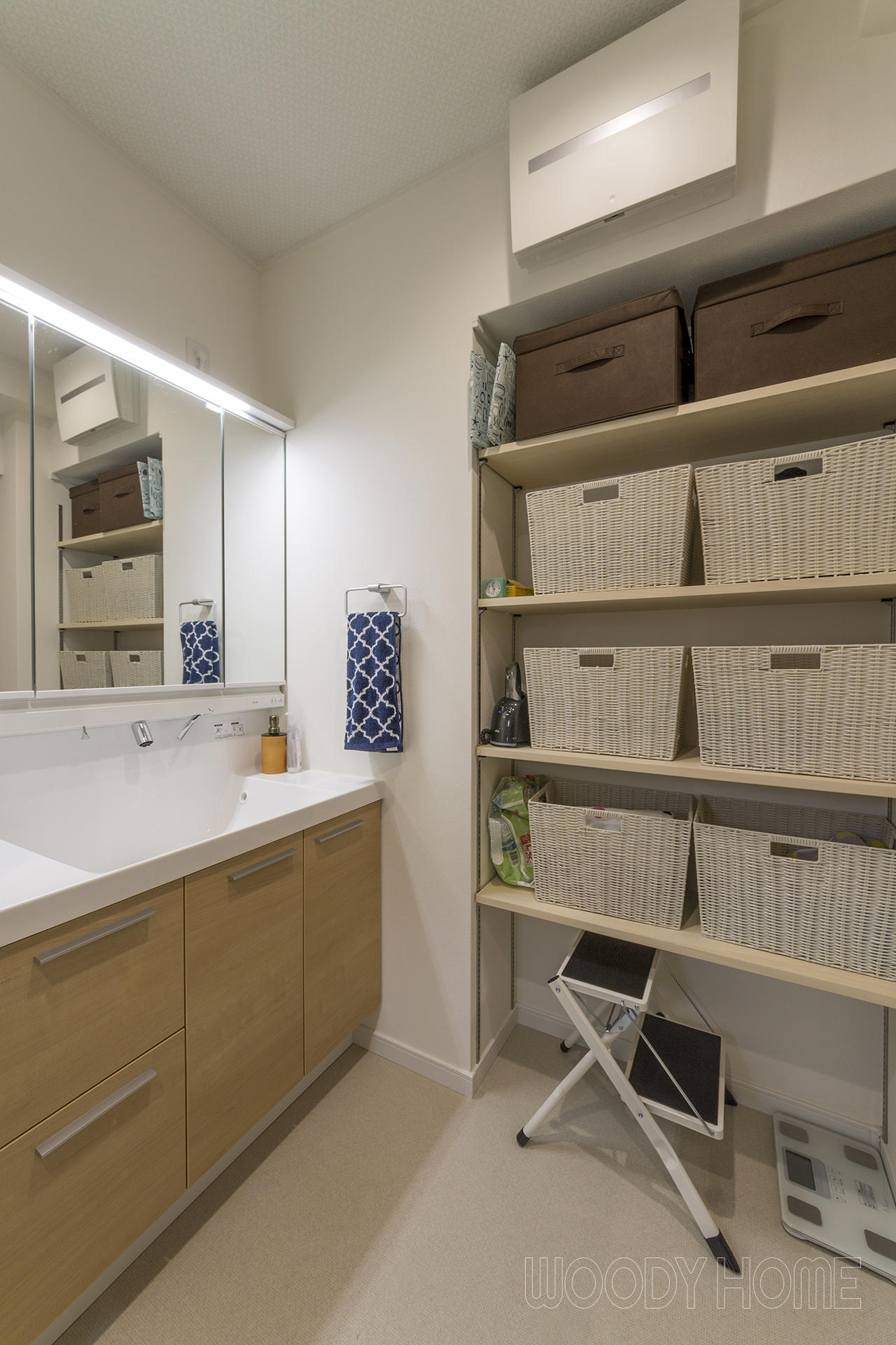 洗面化粧台はLIXILのLC。面材を屋内建具と併せて統一感を持たせています。可動棚を上手に使って小物も綺麗に収まります。節水、節電の機器は家計にも優しいです。
