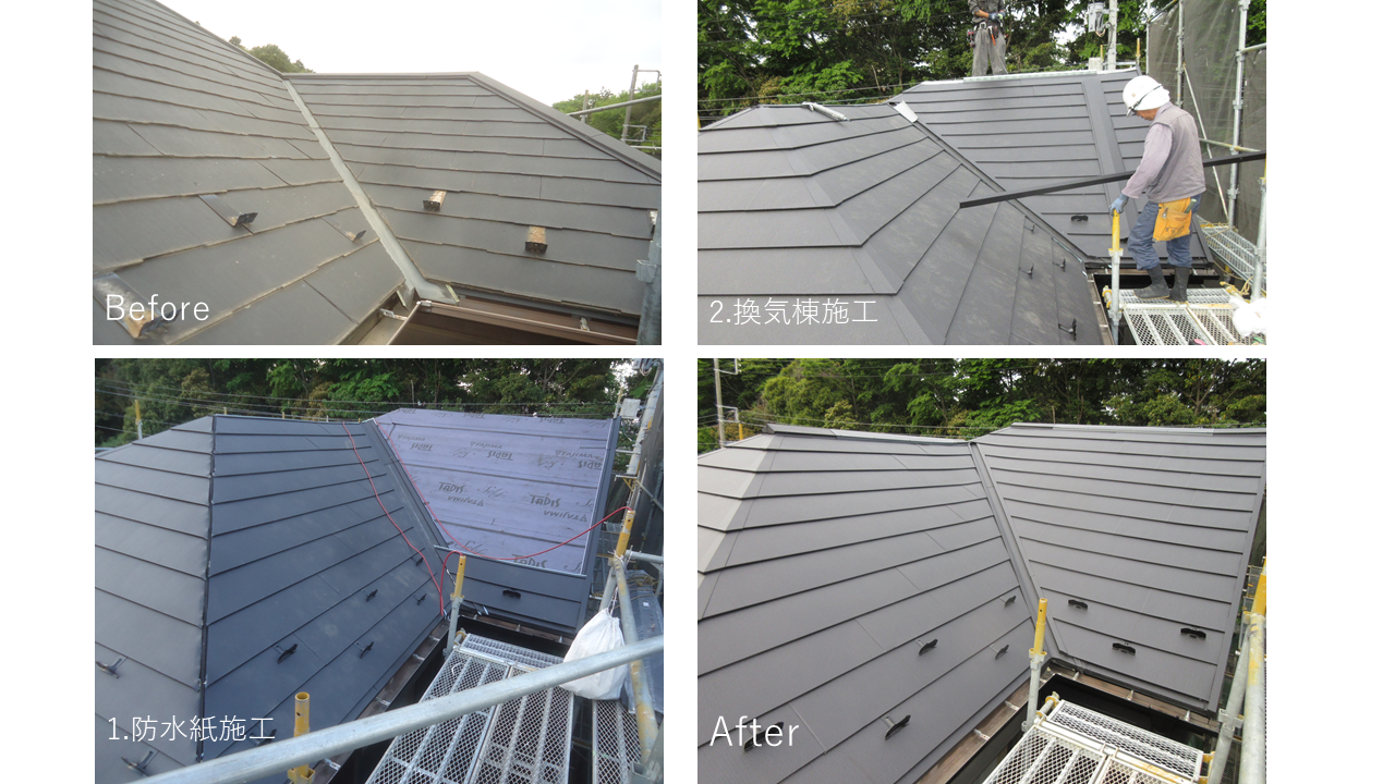 屋根は紫外線や雨を一番受ける場所なので一番劣化が進む場所です。屋根は塗装や葺き替えなど方法は様々ありますが、塗装できる状態は2回程度が限界といわれています。今回はガルバニウム鋼板屋根の重ね貼りです。鋼板屋根を貼る前に防水のシートを屋根全面に施工していきます。弊社の基準と第三者検査機関、JIOの施工基準に則って施工していきます。その後は2階の「暑さ対策」にも一役買う、「換気棟」の施工。天井裏の夏の暑い空気を屋根から逃がし快適な室内空間を作ります。その後は鋼板の切り残しを掃除して完成です!