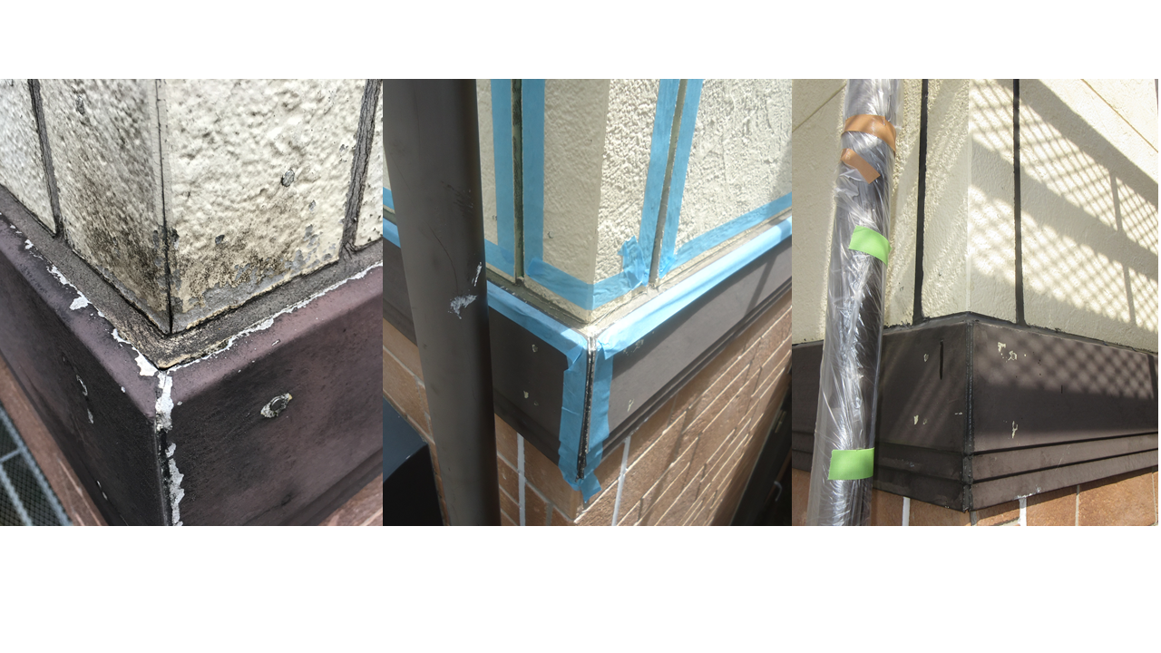 (左)が施工前。コーキングが紫外線や雨風で経年劣化し、ヒビ割れしています。コーキングが切れるとその下地にまで劣化を及ぼす可能性もあります。(中)このコーキングを一度すべて取り払い、マスキング養生をしていきます。そしてここで登場するのが高耐久コーキング!「オートンイクシード+」高耐久塗料を塗装する際はコーキングも高耐久でなければコーキングの方が先に劣化してしまうので、コーキング選びはとても重要になります。(右)コーキング施工後です。幕板(真ん中の横の板)の上と下のコーキングの色が違うのは仕上がりの色に合わせています。