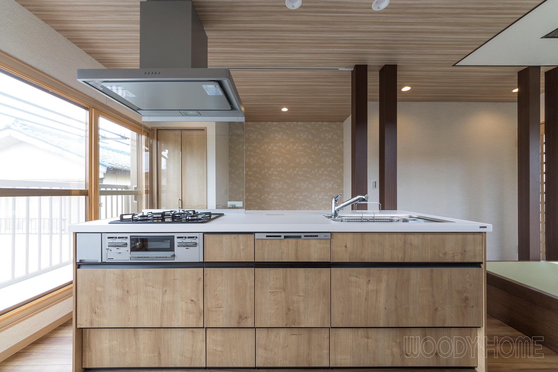 システムキッチンはLIXILの「アレスタ」。面材を床材と合せて一体感を出しています。アイランド型のカウンター付きのキッチンは忙しい朝やちょっとした食事も出来てとても便利です。