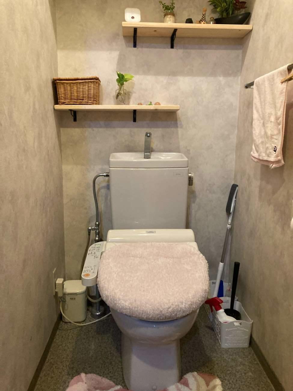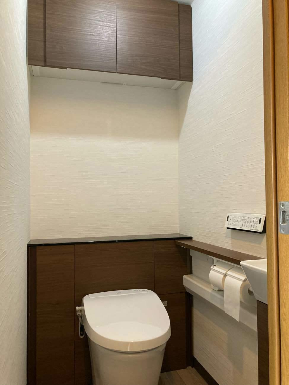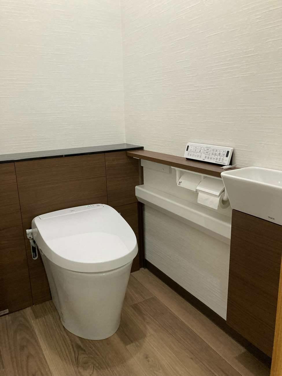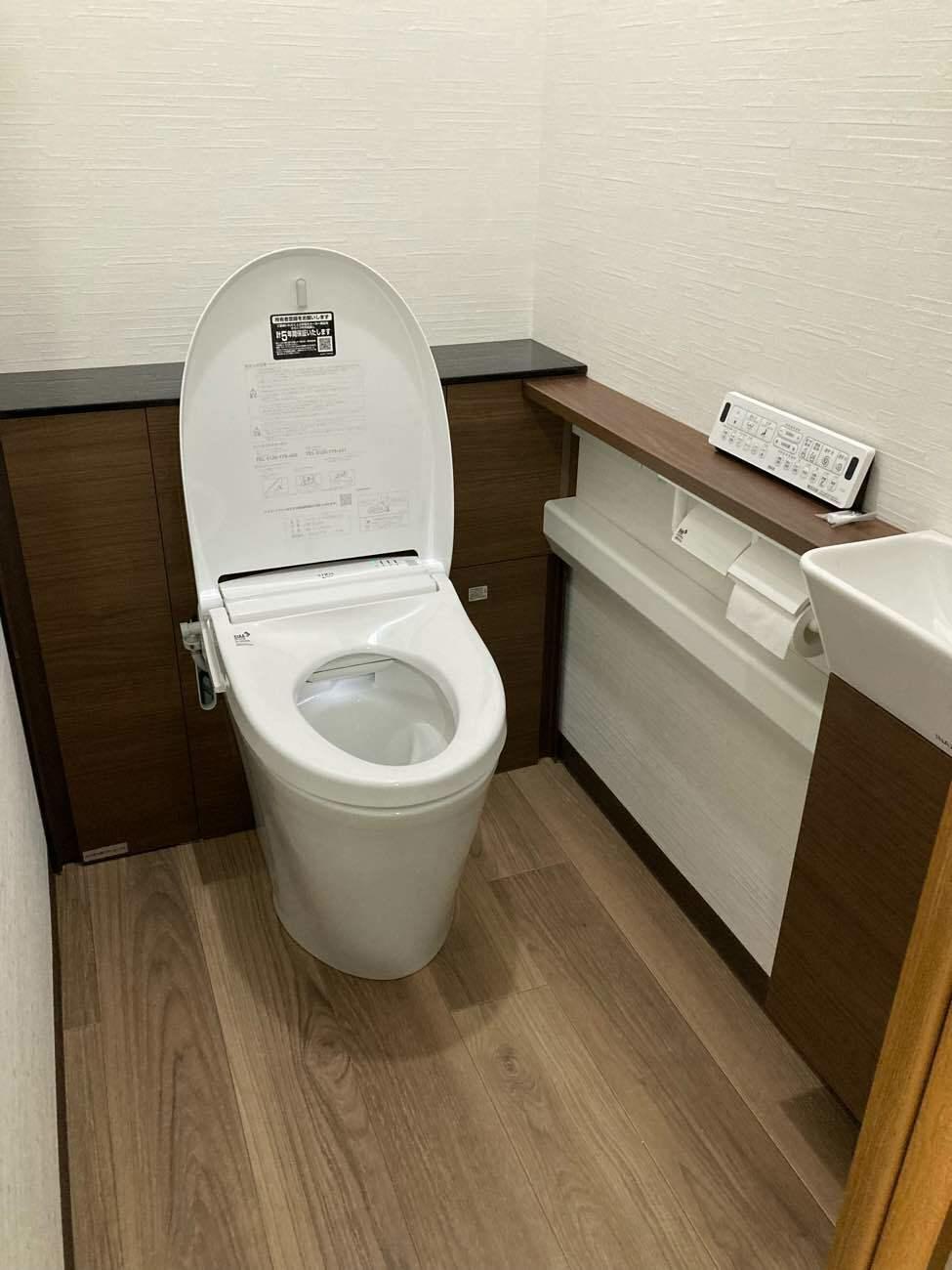 家族が一番使う場所。このトイレ室を快適でシンプルでスッキリとしたい!!というご要望でLIXILのリフォレを提案させていただきました。後ろのスペースは配管もタンクも隠れてスッキリと。