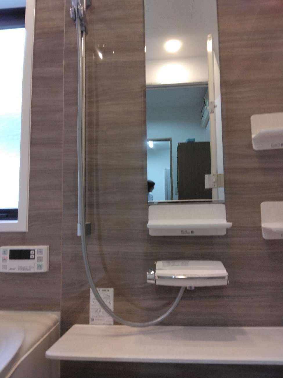 壁パネルは白をベースに、アクセントはウォールナット色を選ばれ、落ち着いた空間になりました。シャワーヘッドは、『エコアクアシャワーSPA』。ミストタイプ、パワフルタイプ、節水タイプなど、その時の気分で自由にタイプを選べます。シャワーバーは手すりとしても使え、浴槽の出入りが楽に安全に。またカウンターは、以前はかがみ込んでで洗われていましたが、新しいカウンターは簡単に外すことができ、楽に丸洗いできます。また、シャンプーなどを置く収納も、マグネットタイプなので、簡単に取り外しができ、丸洗いできますし、ご家族の身長に合わせて位置を自由に変えられます。