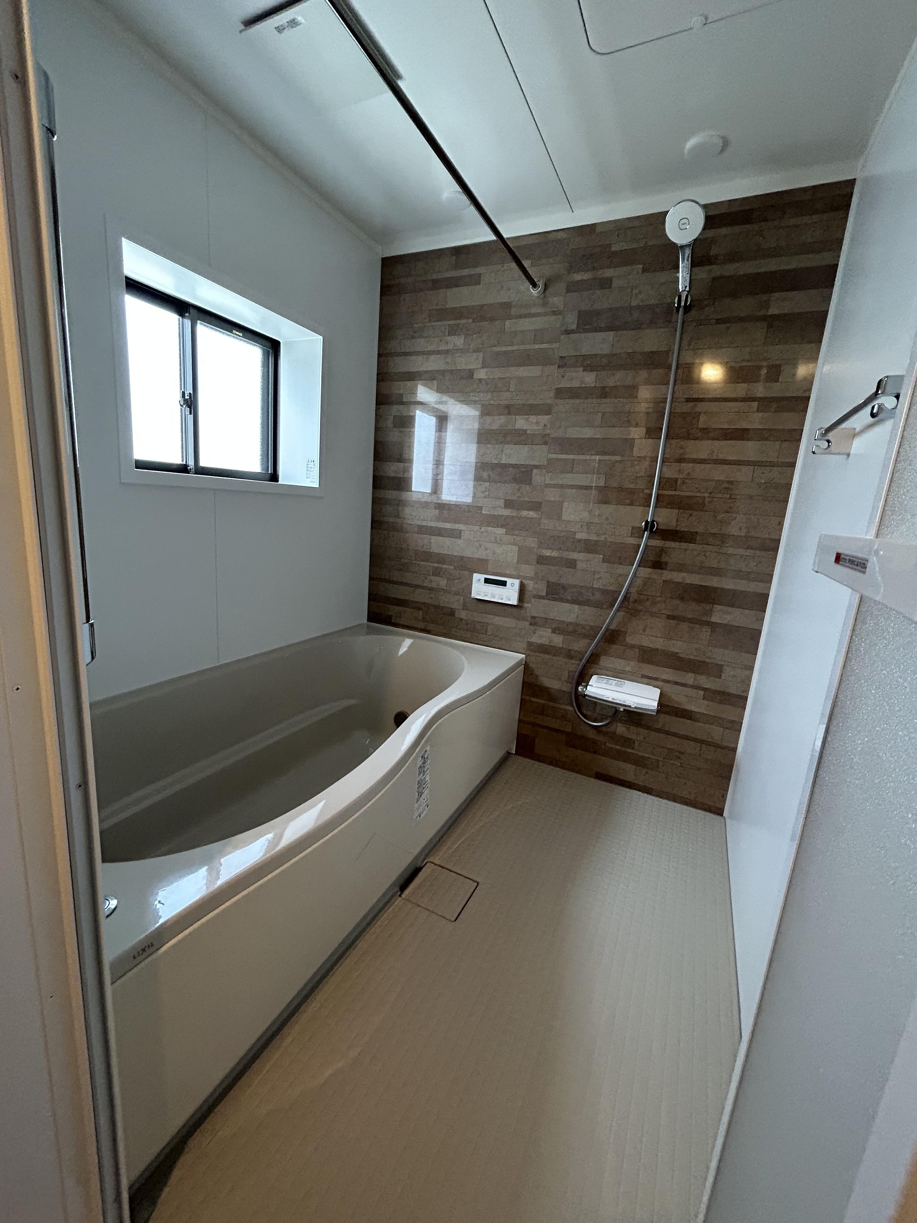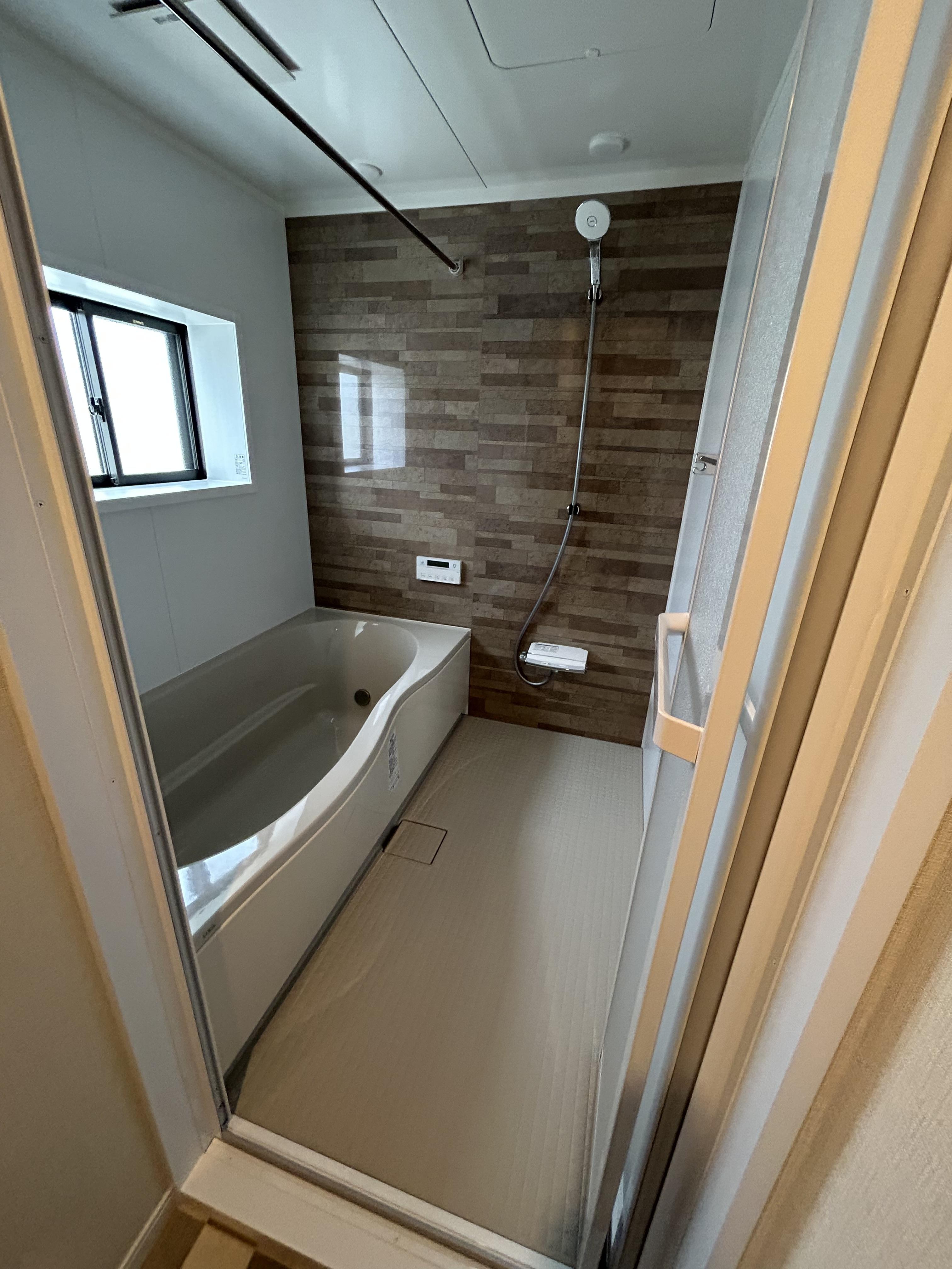 アクセントパネルの色味に合わせて、浴槽と床の色はベージュにし、落ち着いた浴室空間になりました。