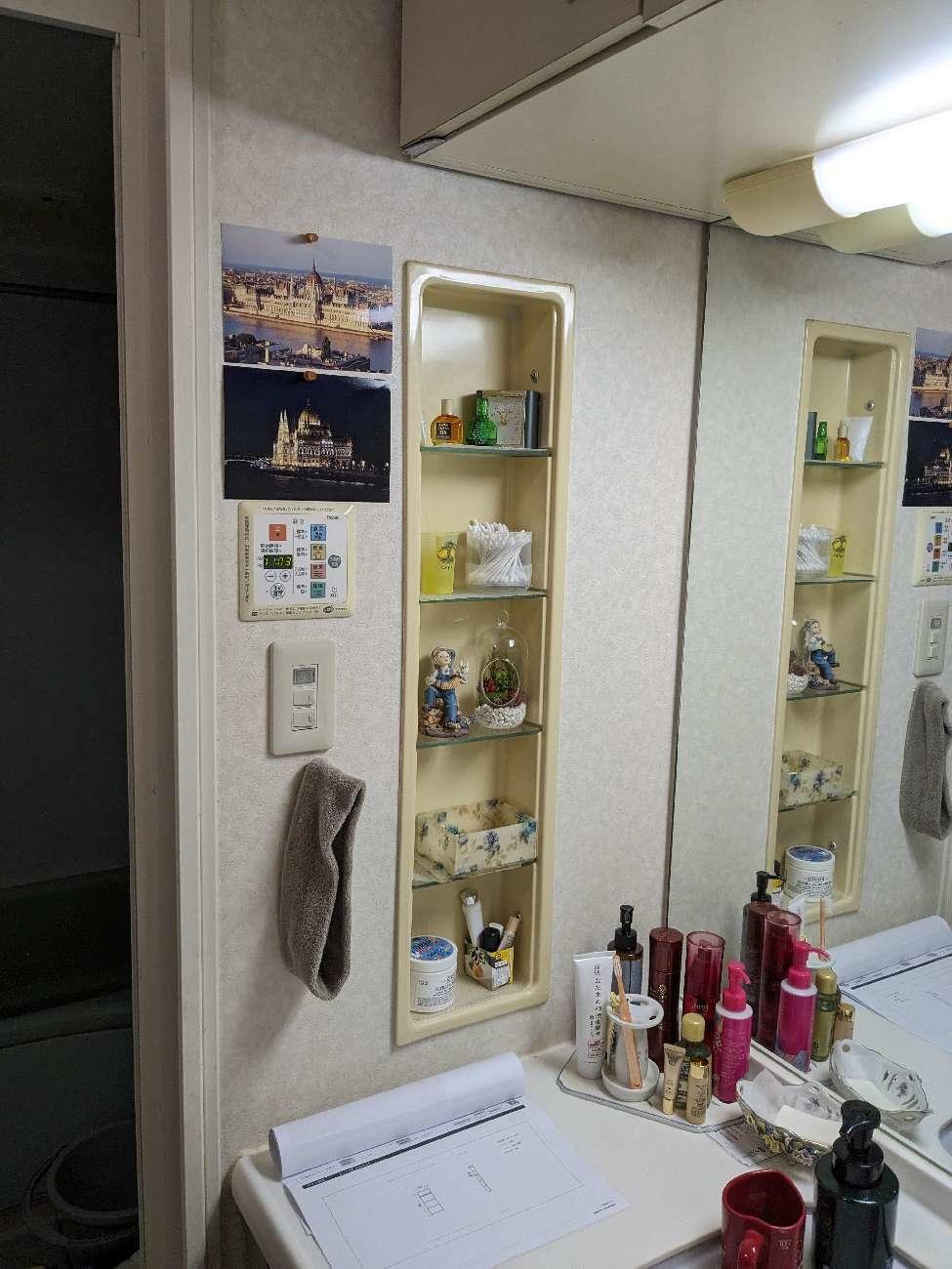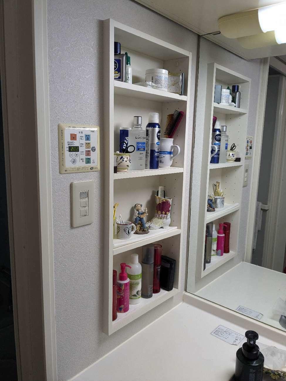 お困りことをしっかりとお伝えいただけてご提案がしやすかったです。工事中も私たちが動きやすいようにお気遣い頂戴しました。 化粧台のシートが木目柄だったので、職人さんが柄合わせを行い、キレイに見えるように仕上げてもらいました。 全体的に喜んでいただけて安堵しております 後日、埋込収納にものを置いたところを撮影させていただきました。スッキリお使いいただけていて嬉しい限りです。